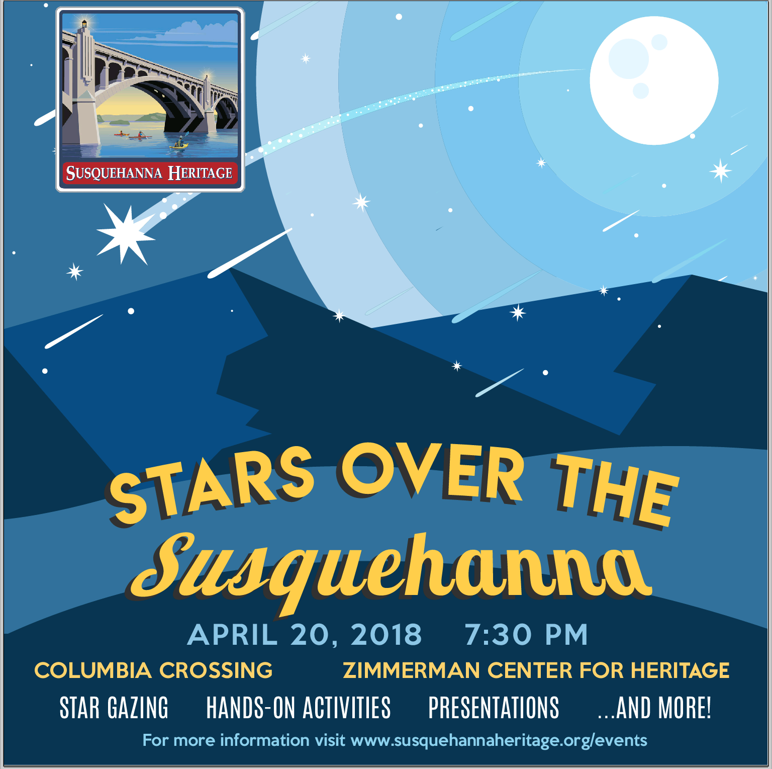 Columbia and Wrightsville, PA – Join Susquehanna Heritage for “Stars Over the Susquehanna” on April 20th for an evening of stargazing and exploring the night sky while celebrating The National Park Service’s Monthly Theme for April: Find Your Park After Dark – Starry Skies.