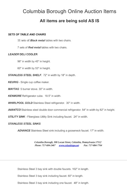Notice is hereby given that the Borough of Columbia, 308 Locust St, Columbia, PA, Lancaster County, Pennsylvania, will be holding an on-line auction of surplus items. A complete list of items can be found on our website, www.columbiapa.net or a copy may be obtained at the front desk between the hours of 9:00 am and 4:30pm. All items may be inspected at the Borough of Columbia. The auction begins May 9, 2018 and ends on May 23, 2018.