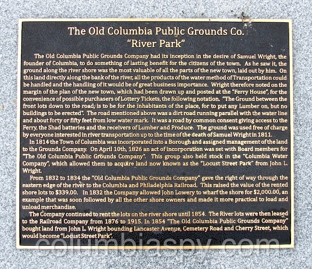Columbia River Park, From the Columbia Borough website: “The Borough of Columbia, under a 99-year lease with the Old Columbia Public Grounds Company, is responsible along with the Pennsylvania Fish & Boat Commission (PAF&BC) for the management and maintenance of an approximate four acre parcel known as Columbia River Park.”