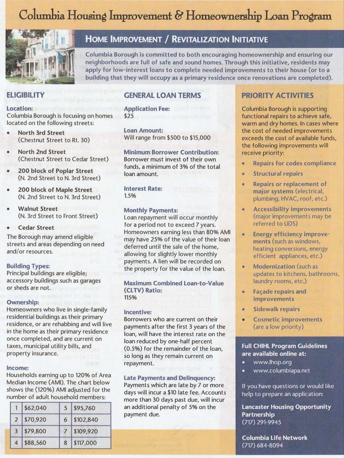 Loans are available to eligible Columbia residents for home improvements through CHIHL Program – Assistance is also available for first-time home buyers Applicants must be current on taxes, municipal utility bills, and property insurance. Share this: Click to share on X (Opens in new window) X Click to share on Facebook (Opens in new window) Facebook More Click to share on Bluesky (Opens in new window) Bluesky Click to share on X (Opens in new window) X Like Loading... Related