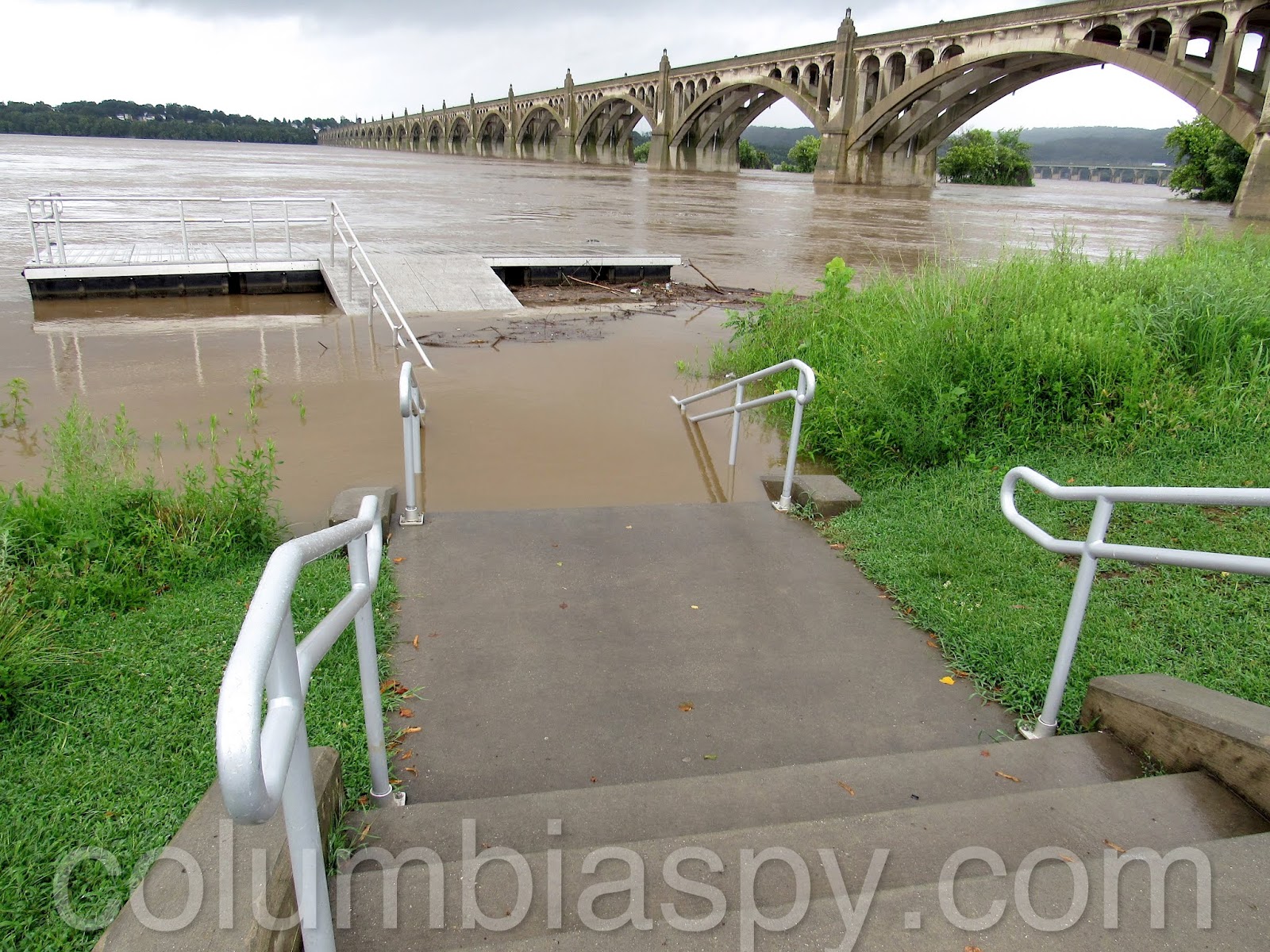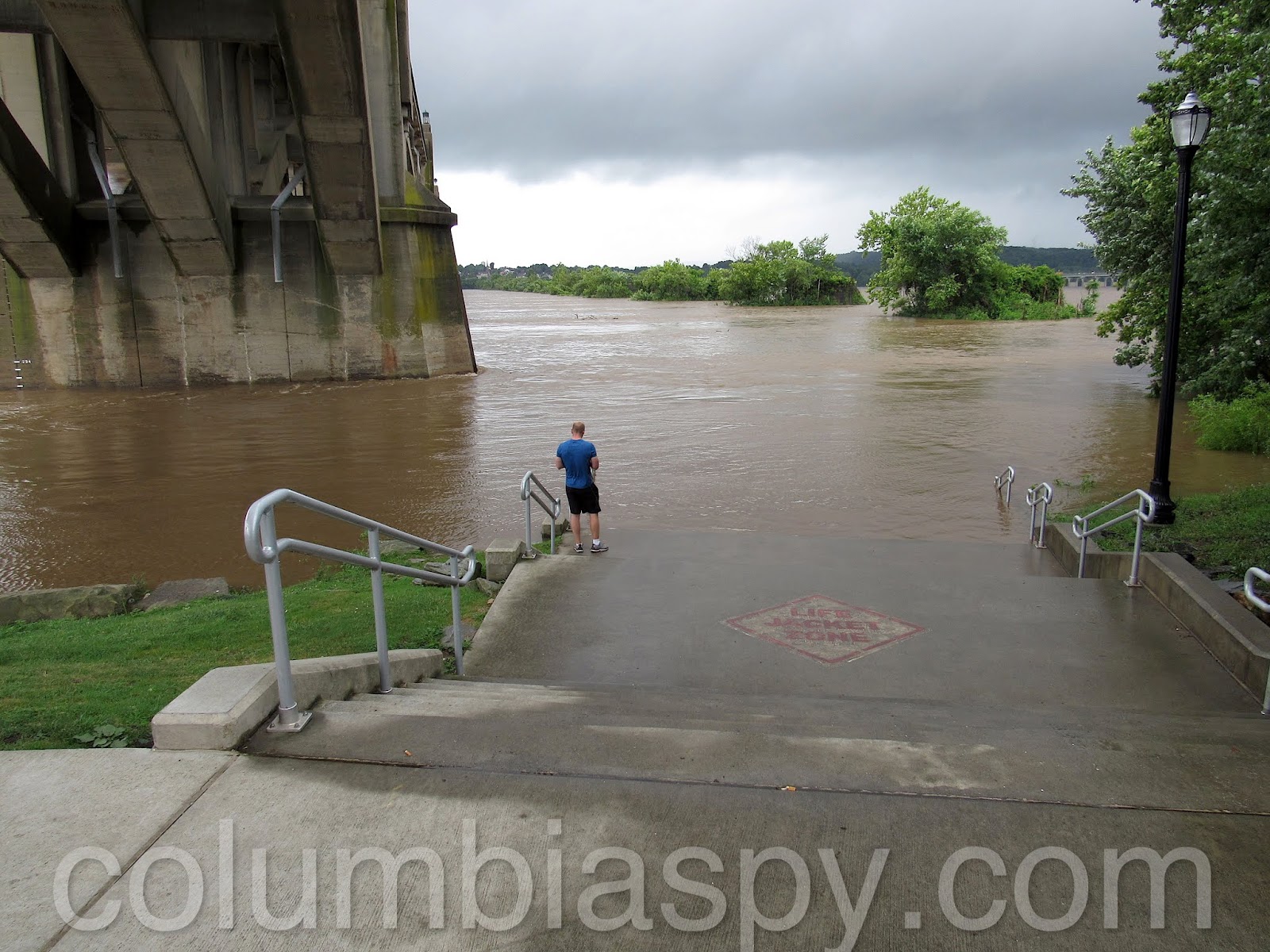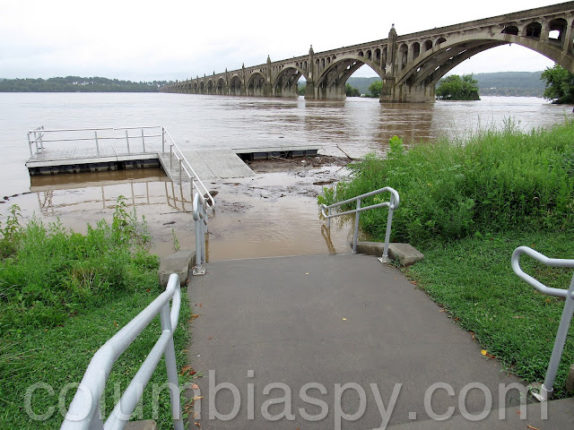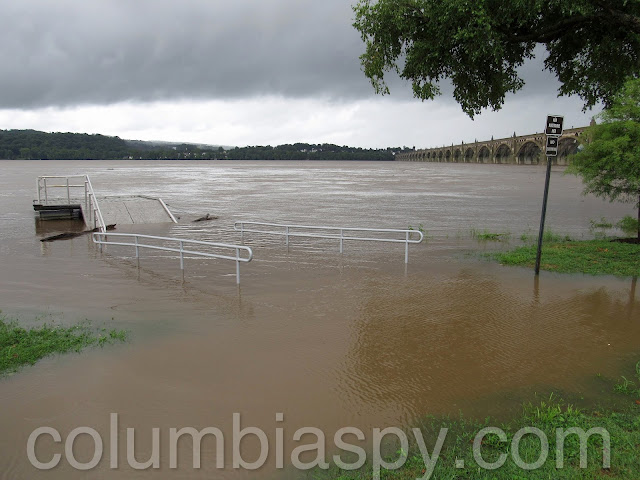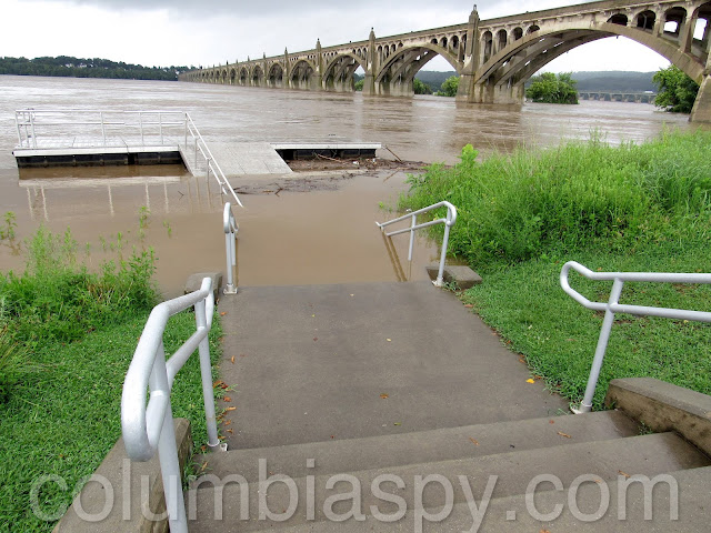 The lower steps at the kayak launch area disappeared as waters continued to rise.