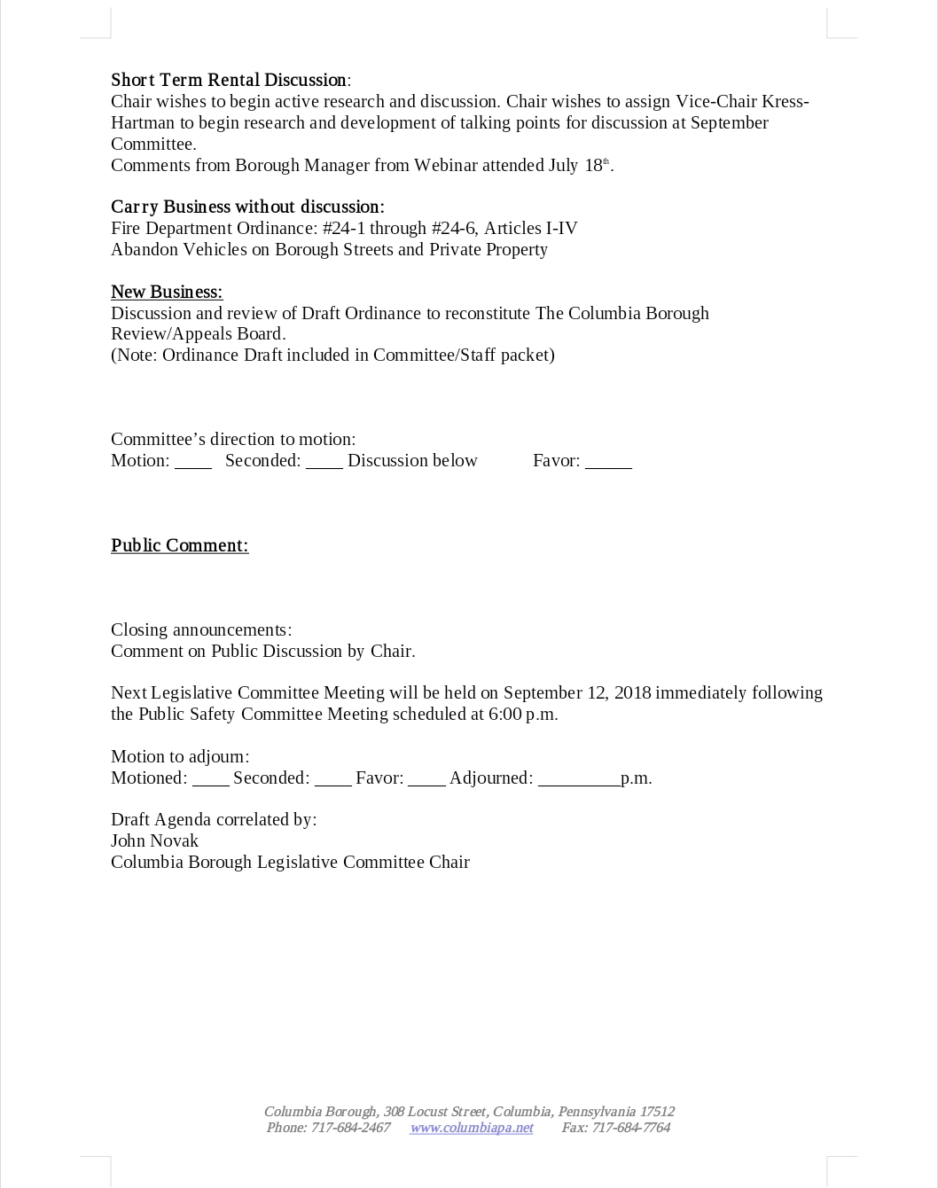 4. Robert's Rules of Order is supposed to guide Columbia Borough's actions. There's more on that and the construction of meeting agendas here: http://westsidetoastmasters.com/resources/roberts_rules/chap2.htmlor here:http://www.roberts-rules.com/parl02.htmThis Penn Live article, perhaps, says that agendas can be confusing (When it comes to government meetings, not all agendas are equal): https://www.pennlive.com/news/2016/03/when_it_comes_to_government_me.html