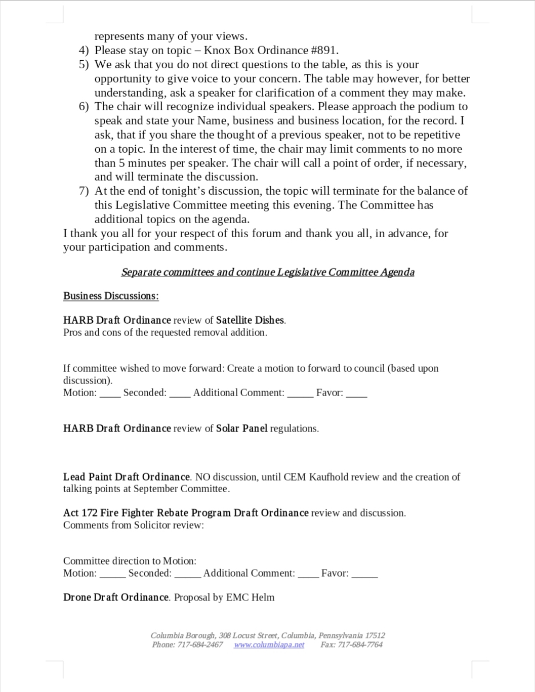 The draft agenda for Wednesday night’s legislative committee meeting is shown below. The borough’s Knox Box ordinance is scheduled to be discussed. The ordinance requires all places of business to have key lock boxes, commonly known as Knox Boxes, installed and accessible to emergency personnel. The ordinance was passed in December 2017 and gives business owners a year to comply. At July’s borough council meeting, several citizens voiced their opposition to the ordinance.