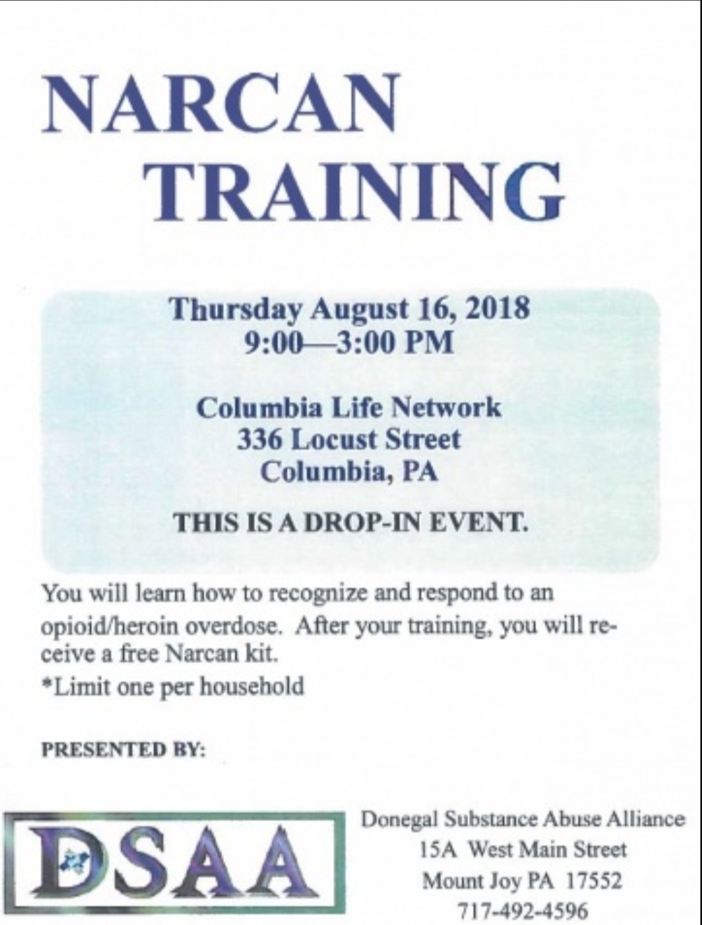 A Narcan Training Session will be held at the Columbia Life Network located at 336 Locust Street, Columbia, PA on Thursday, August 16, 2018 from 9:00am-3:00pm (drop-in). Attendees will learn how to recognize and respond to an opioid/heroin overdose. After your training, you will receive a free Narcan kit. (Limit one kit per household) The training session is being presented by DSAA (Donegal Substance Abuse Alliance/15A West Main Street, Mount Joy, PA/717-492-4596).