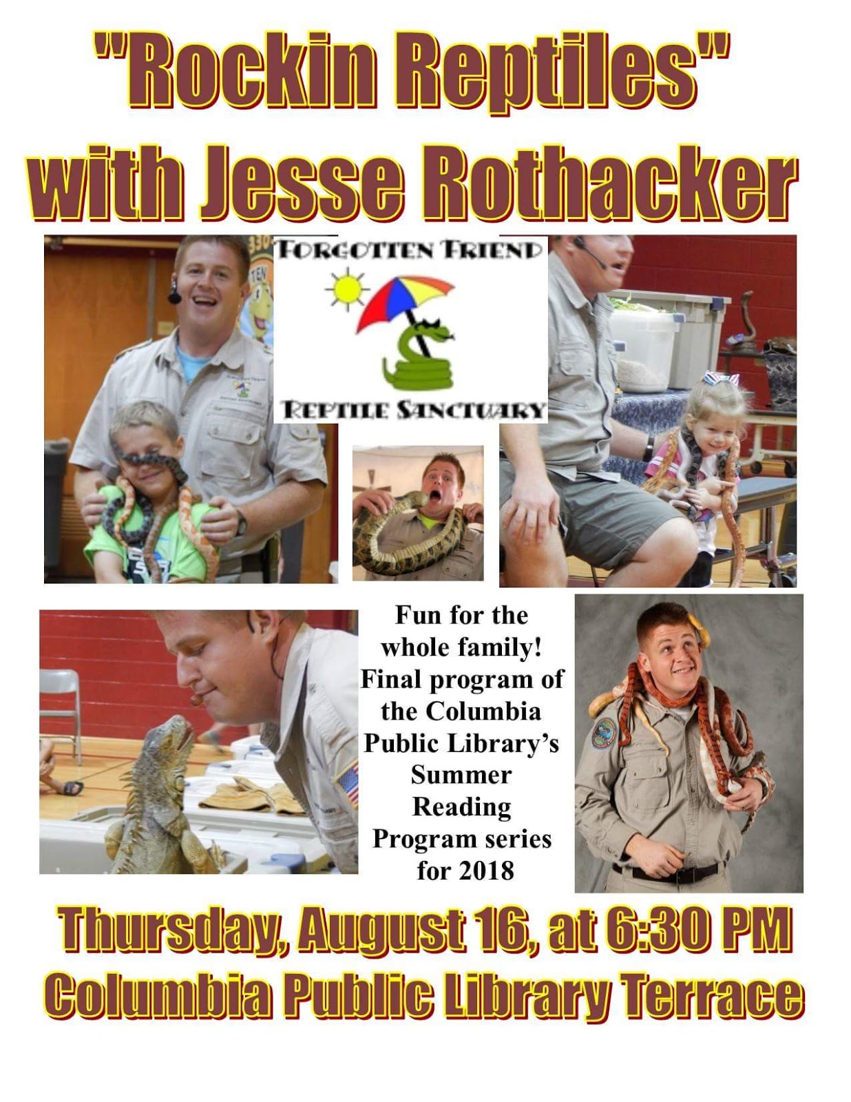 Rockin' Reptiles on the Library Terrace Thursday, August 16, at 6:30 p.m. Share this: Share on X (Opens in new window) X Share on Facebook (Opens in new window) Facebook More Share on Bluesky (Opens in new window) Bluesky Share on X (Opens in new window) X Like Loading... Related