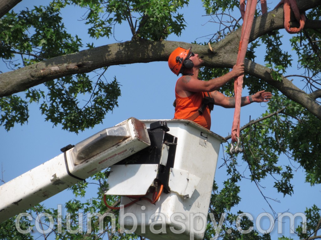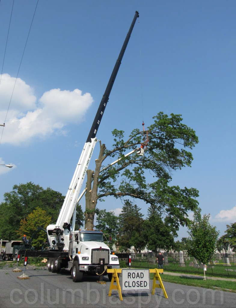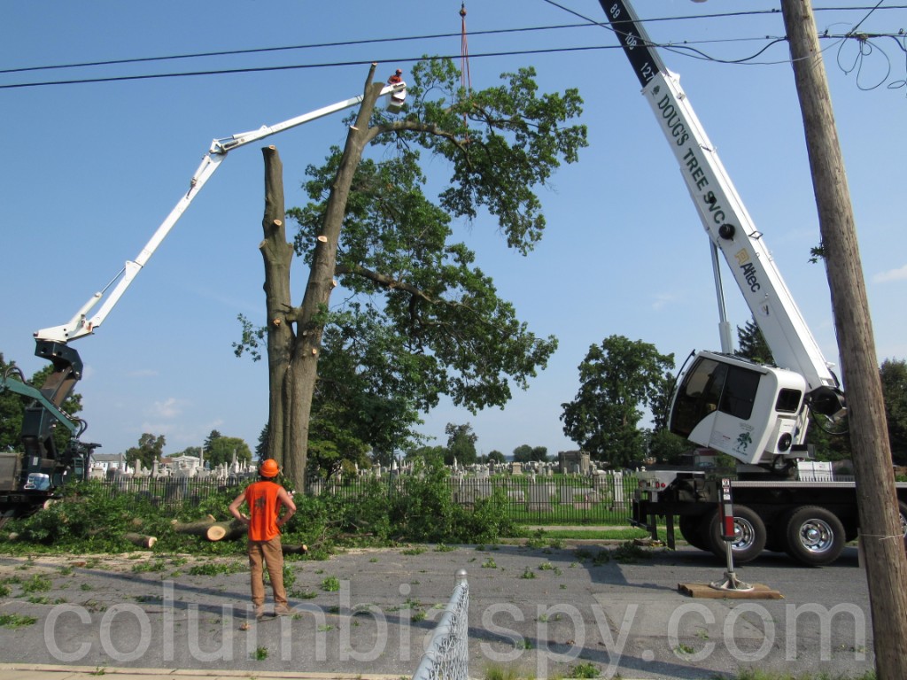 Doug’s Tree Service cut down an oak tree along the sidewalk at Mount Bethel Cemetery this afternoon. Mount Bethel spokesman Ron Mable said it was necessary to take the tree down, because it was dying. Several other trees have been cut down inside the cemetery over the past few years.