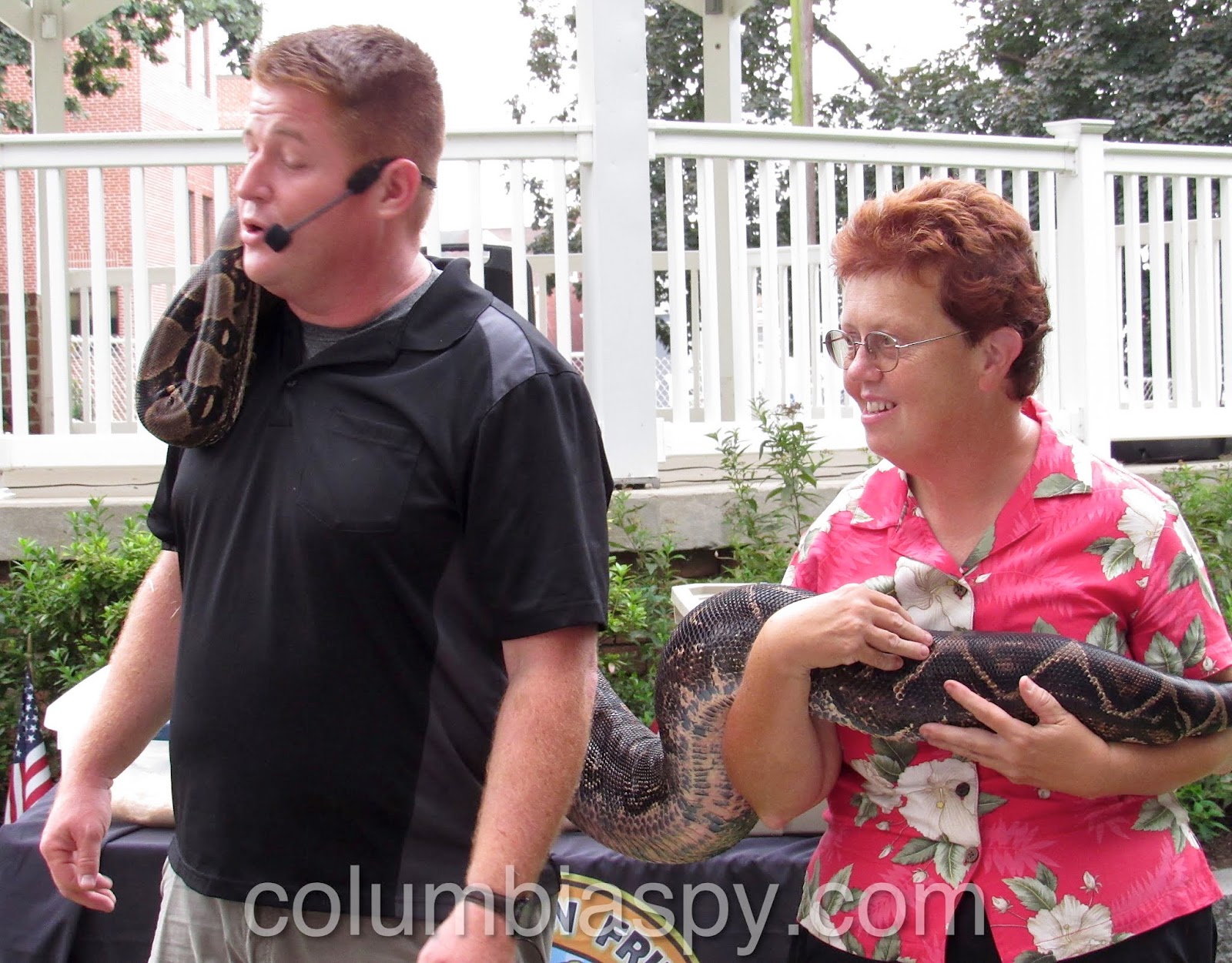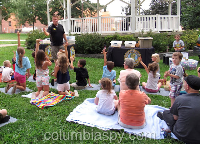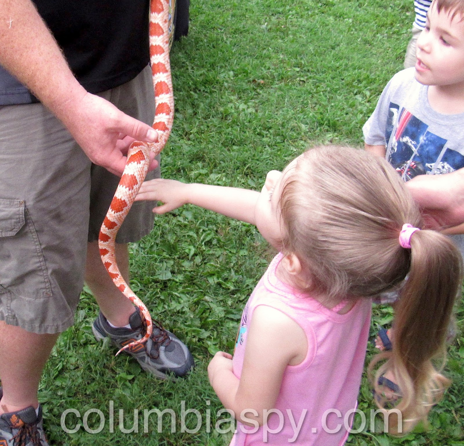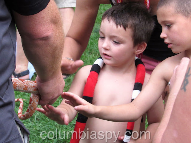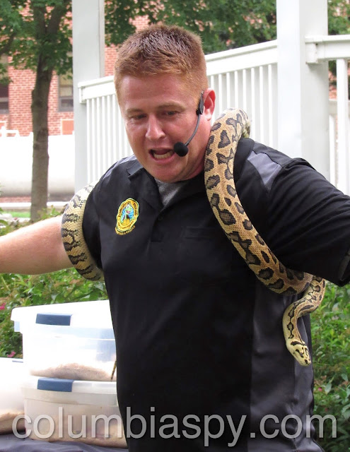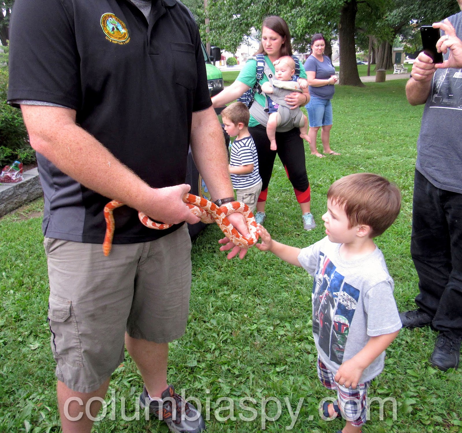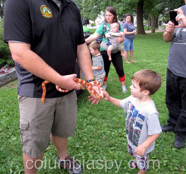 Herpetologist Jesse Rothacker finished out the Columbia Public Library’s summer reading program series with “Rockin’ Reptiles” Thursday evening – to the delight of children and adults. Rothacker, the founder of Forgotten Friend Reptile Sanctuary, presented a variety of reptiles – snakes, lizards, crocidilians, and a tortoise named “Abraham” – to onlookers in Locust Street Park. Children were permitted to handle and touch some of the animals.