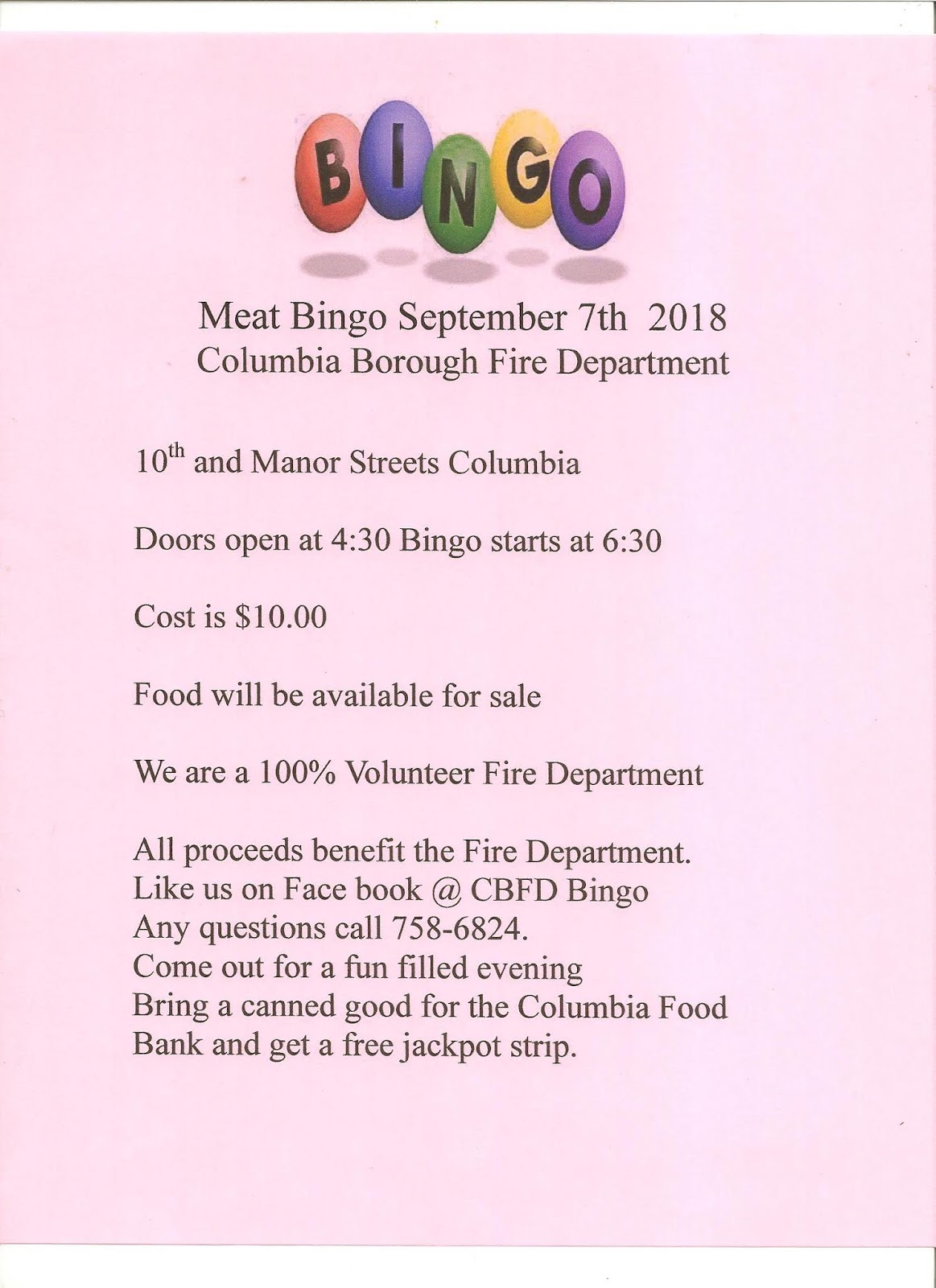 Meat Bingo at CBFD this Friday, September 7 Share this: Share on X (Opens in new window) X Share on Facebook (Opens in new window) Facebook More Share on Bluesky (Opens in new window) Bluesky Share on X (Opens in new window) X Like Loading... Related