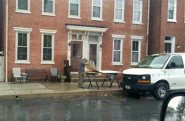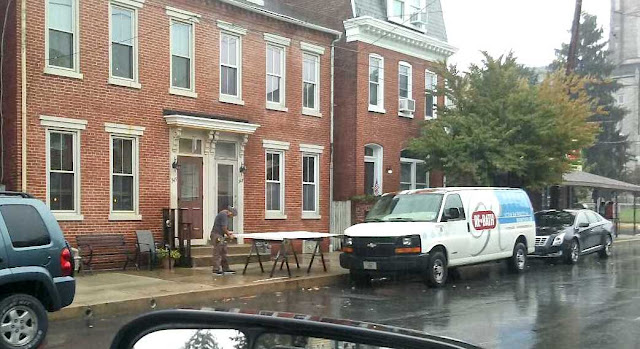 And last, but certainly not least, the following two submitted photos of a Re-Bath worker working in the rain (which seems somehow appropriate, if you think about it)…