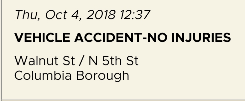 Vehicle accident – No Injuries An accident involving a pickup truck and another vehicle occurred today at 5th and Walnut at 12:37 p.m. No injuries were reported. Share this: Share on X (Opens in new window) X Share on Facebook (Opens in new window) Facebook More Share on Bluesky (Opens in new window) Bluesky Share on X (Opens in new window) X Like Loading... Related