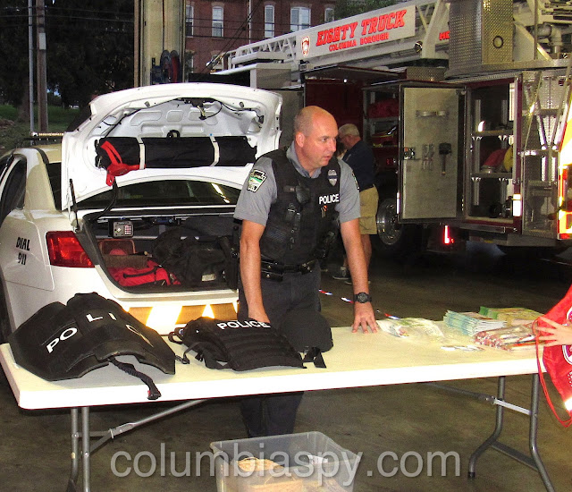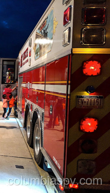 Riding on a fire engine is a fantasy for most kids, but last night it became a reality for those visiting Columbia Borough Fire Department’s Open House. Before climbing aboard the trucks, however, children collected several fire safety related items to fill the backpacks they received there. They also got close-up looks inside an ambulance, police car, and a QRS vehicle. Sparky the Fire Dog greeted guests, many of whom posed with him for photos. Although activities were designed to be fun, education remained at the forefront to teach children (and adults) about fire prevention and safety. Several kids even braved entering a fire safety trailer filled with smoke to learn how to escape a fire. Free food and refreshments were also served at the event.