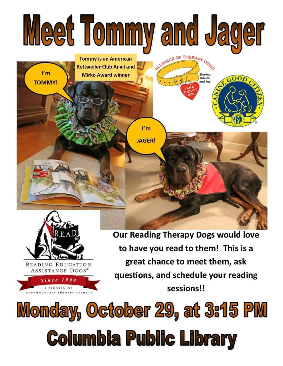 Meet Tommy and Jager at the Library Monday, October 29 Share this: Share on X (Opens in new window) X Share on Facebook (Opens in new window) Facebook More Share on Bluesky (Opens in new window) Bluesky Share on X (Opens in new window) X Like Loading... Related
