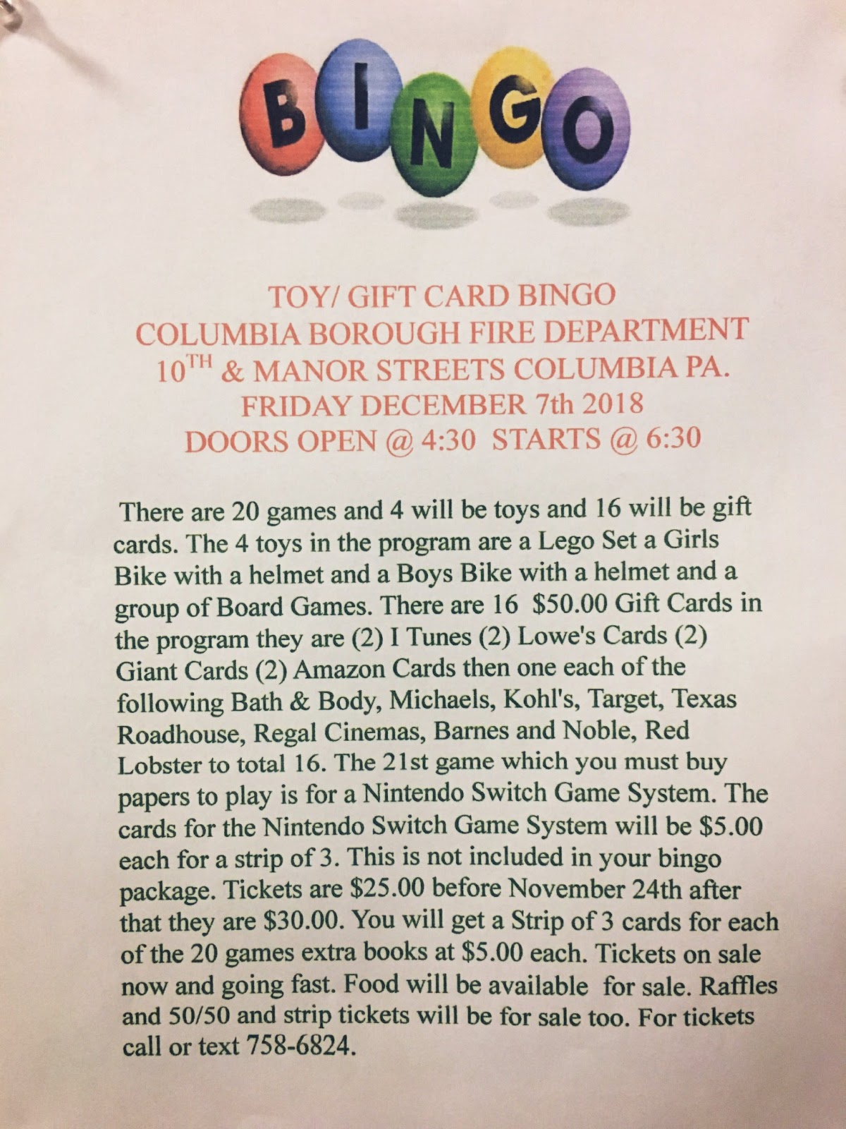 Toy/Gift Card Bingo at CBFD Friday, December 7 Share this: Share on X (Opens in new window) X Share on Facebook (Opens in new window) Facebook More Share on Bluesky (Opens in new window) Bluesky Share on X (Opens in new window) X Like Loading... Related