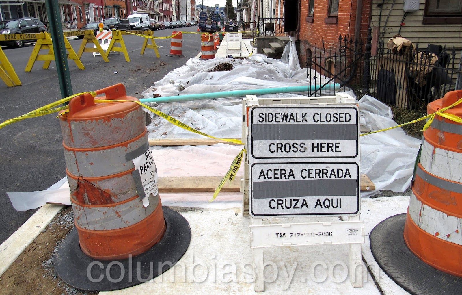Contractors are currently scrambling to finish remedial work on several Walnut Street sidewalks. The sidewalks are part of an overall road project on the 500 and 600 blocks that includes road paving, curbs, and ramps. As Columbia Spy reported HERE, property owners on the two blocks complained to borough council recently about various problems with the project.