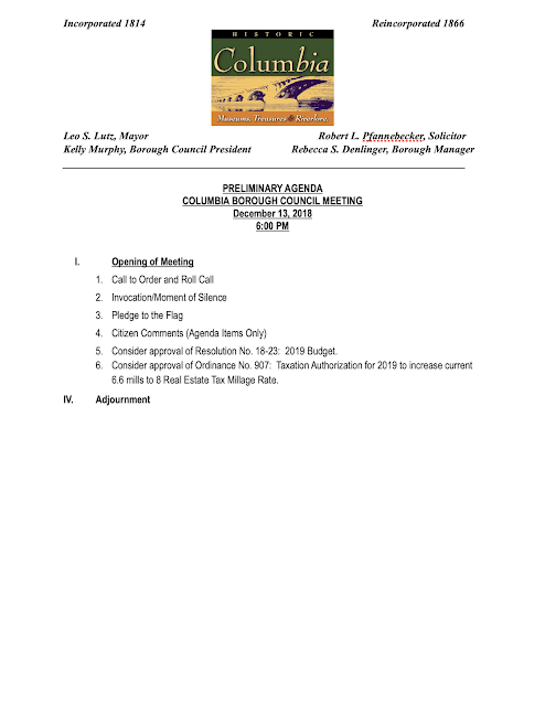 Notice is hereby given that the Borough Council of the Borough of Columbia, at a meeting to be held on December 13, 2018, at 6:00pm in Council Chambers of the Borough Municipal Building located at 308 Locust Street, Columbia, will consider for adoption Resolution No. 18- 23 adopting the budget for the Borough of Columbia for the year 2019 and will consider for adoption Ordinance No. 907 fixing the real estate tax millage rate for 2019 at 8 mills, which is $.80 of tax for each $100 of assessed real estate valuation. This action will result in an increase from the 2018 real estate tax rate. Any person with a disability wishing to attend the meeting may contact the Borough Office at 717-684-2467 for necessary accommodations. Notice is further given that the proposed budget for the year 2019 referenced above is available for public inspection at the Municipal Building, 308 Locust Street, Columbia, Pennsylvania. Business office hours are 8am to 4:30pm Monday through Friday, except holidays