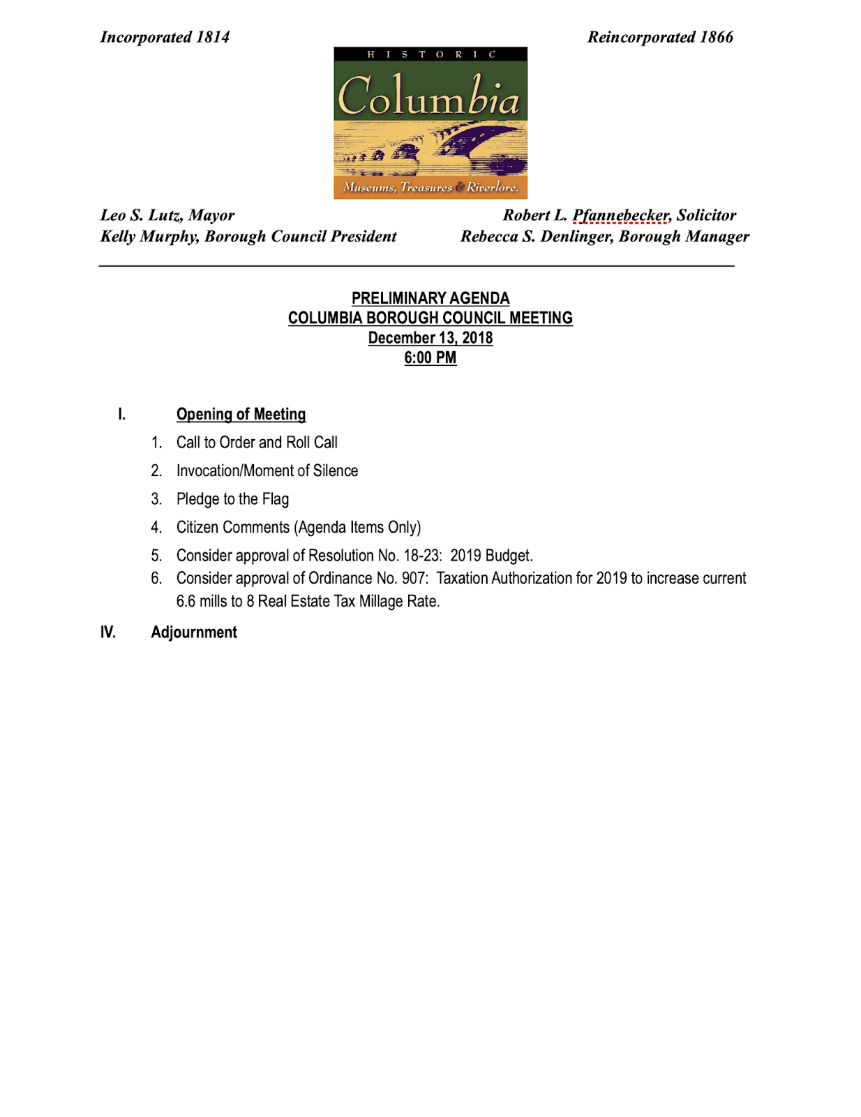 Notice is hereby given that the Borough Council of the Borough of Columbia, at a meeting to be held on December 13, 2018, at 6:00pm in Council Chambers of the Borough Municipal Building located at 308 Locust Street, Columbia, will consider for adoption Resolution No. 18- 23 adopting the budget for the Borough of Columbia for the year 2019 and will consider for adoption Ordinance No. 907 fixing the real estate tax millage rate for 2019 at 8 mills, which is $.80 of tax for each $100 of assessed real estate valuation. This action will result in an increase from the 2018 real estate tax rate. Any person with a disability wishing to attend the meeting may contact the Borough Office at 717-684-2467 for necessary accommodations. Notice is further given that the proposed budget for the year 2019 referenced above is available for public inspection at the Municipal Building, 308 Locust Street, Columbia, Pennsylvania. Business office hours are 8am to 4:30pm Monday through Friday, except holidays