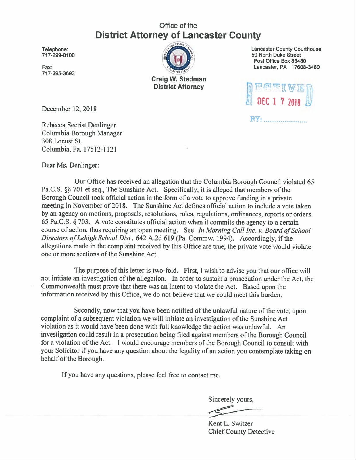 Shown below is a letter from the Lancaster County District Attorney’s Office to the Columbia Borough manager addressing an alleged violation of the Pennsylvania Sunshine Act by the Borough of Columbia. Columbia Spy obtained the letter through a right-to-know request submitted to Columbia Borough’s Open Records Officer. The alleged violation occurred sometime between two budget meetings held November 1 and November 7 of last year in which a vote to fund a newly created full-time Property Inspector position was taken privately. A candidate was approved for the position at the October 8, 2018 borough council meeting by unanimous vote. At the November 1 budget meeting, however, council found it might not able to pay the employee’s salary. Subsequently, funding was approved in a 6-1 vote at the aforementioned private meeting – a possible Sunshine Act violation.