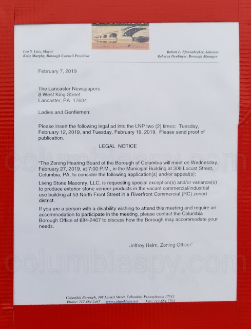 Living Stones Masonry LLC is requesting special exception(s) and/or variance(s) to produce exterior stone veneer products at 53 North Front Street, according to a letter (shown above) taped to the door of the address. The letter also gives notice of a Zoning Hearing Board meeting on February 27 to consider the request.