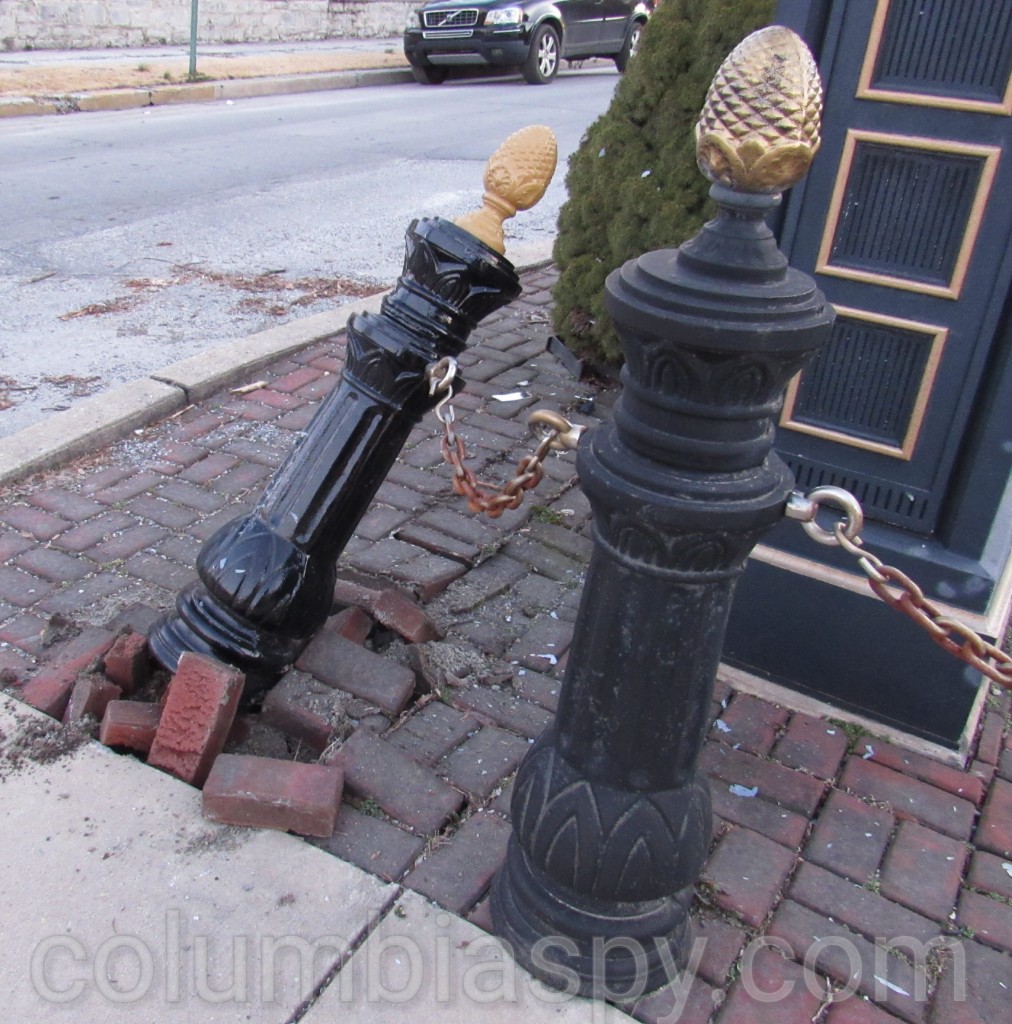 An SUV was facing west at the intersection as the driver was waiting to pull out from the stop sign, when another driver, traveling east on Route 462 attempted to enter a one-way stretch of road on the 500 block of Chestnut. The SUV driver turned slightly as she saw the approaching car that subsequently sideswiped the bollard, knocking it loose. (The same bollard was damaged in a traffic incident at the plaza several months ago.)