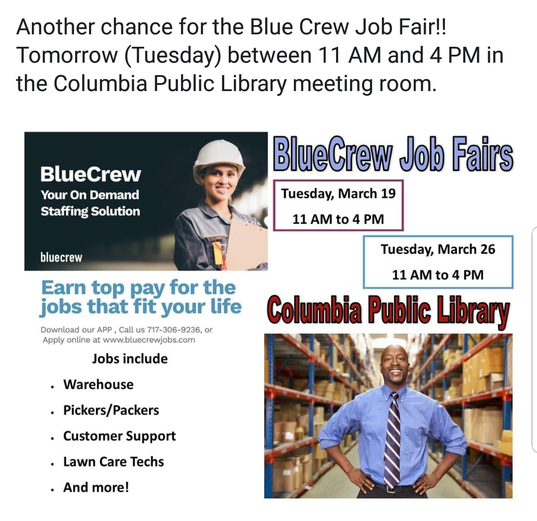 Blue Crew Job Fair at the Library Tuesday, March 26, 11 a.m. to 4 p.m. Share this: Share on X (Opens in new window) X Share on Facebook (Opens in new window) Facebook More Share on Bluesky (Opens in new window) Bluesky Share on X (Opens in new window) X Like Loading... Related