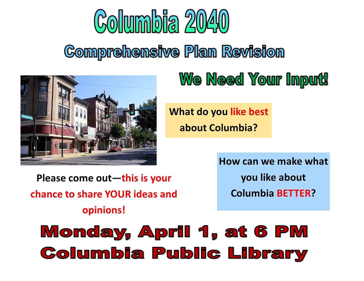 Give your input on Columbia 2040 – at the Library, April 1 at 6 p.m. Share this: Share on X (Opens in new window) X Share on Facebook (Opens in new window) Facebook More Share on Bluesky (Opens in new window) Bluesky Share on X (Opens in new window) X Like Loading... Related