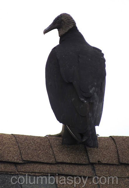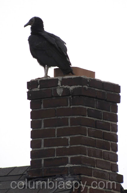 Black vulture atop brick chimney