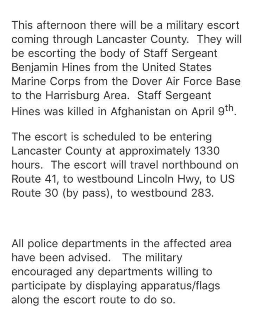 Military escort with body of Marine killed in Afghanistan to pass through Lancaster County Saturday, April 20th Share this: Share on X (Opens in new window) X Share on Facebook (Opens in new window) Facebook More Share on Bluesky (Opens in new window) Bluesky Share on X (Opens in new window) X Like Loading... Related