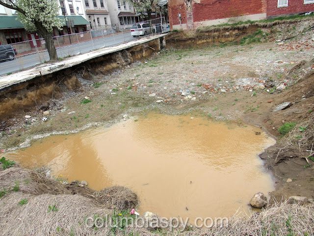 The “hole in the ground” at the bottom of Locust Street, where a house was demolished to make way for an apartment building. The project is currently on hold.