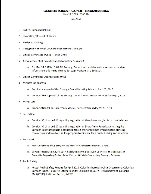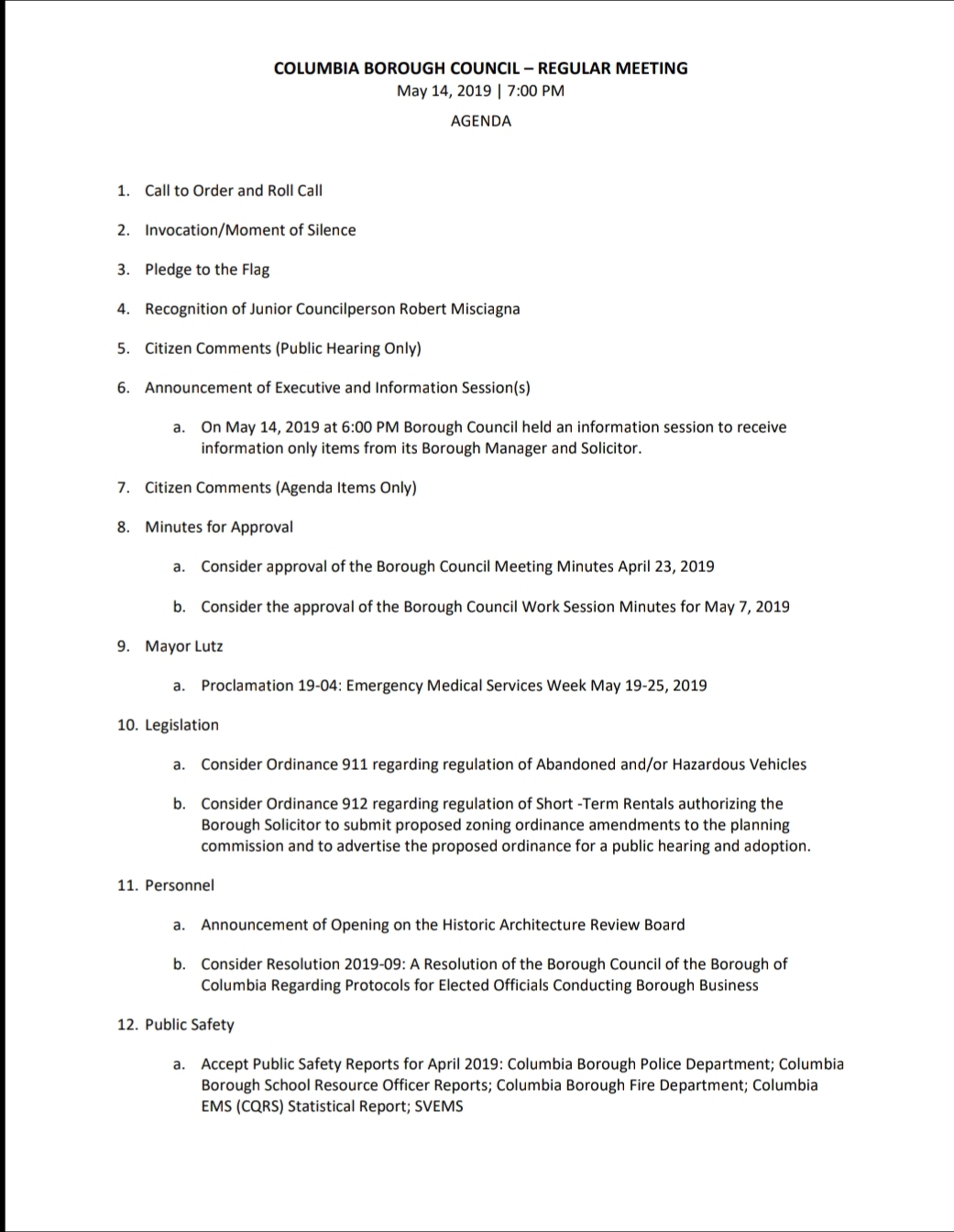 Agenda – Columbia Borough Council Meeting, May 14, 2019 The council packet can be downloaded HERE. Share this: Share on X (Opens in new window) X Share on Facebook (Opens in new window) Facebook More Share on Bluesky (Opens in new window) Bluesky Share on X (Opens in new window) X Like Loading... Related
