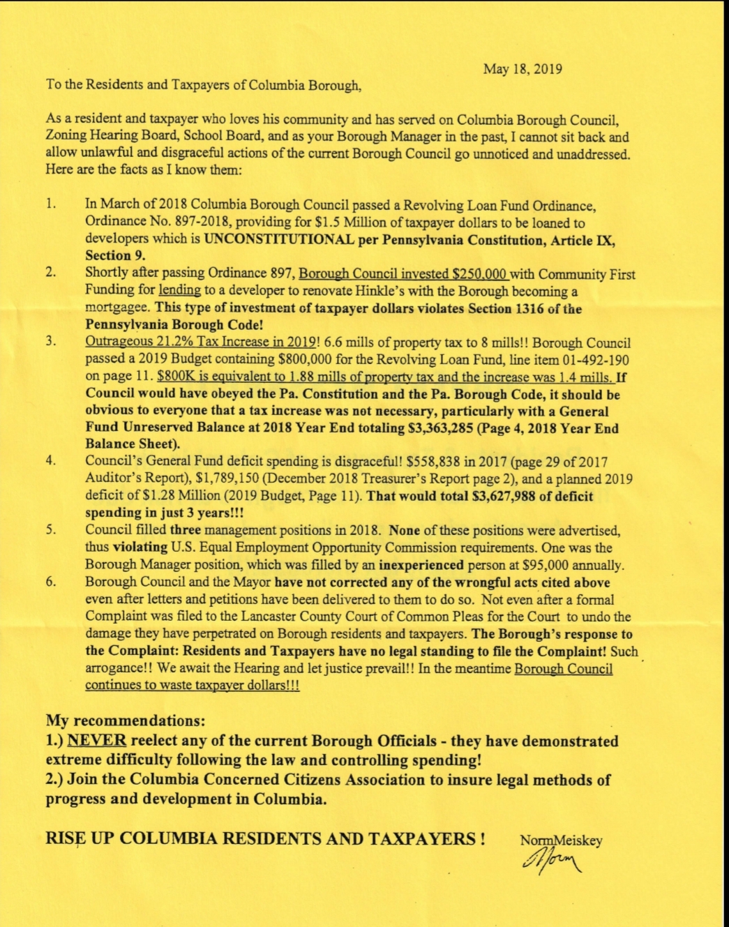 Norm Meiskey’s letter to the residents and taxpayers of Columbia listing the “unlawful and disgraceful actions of the current Borough Council”