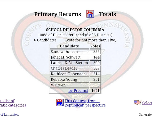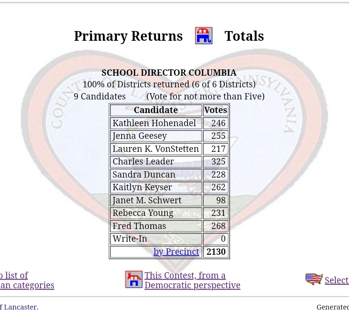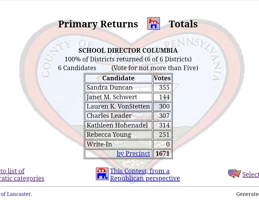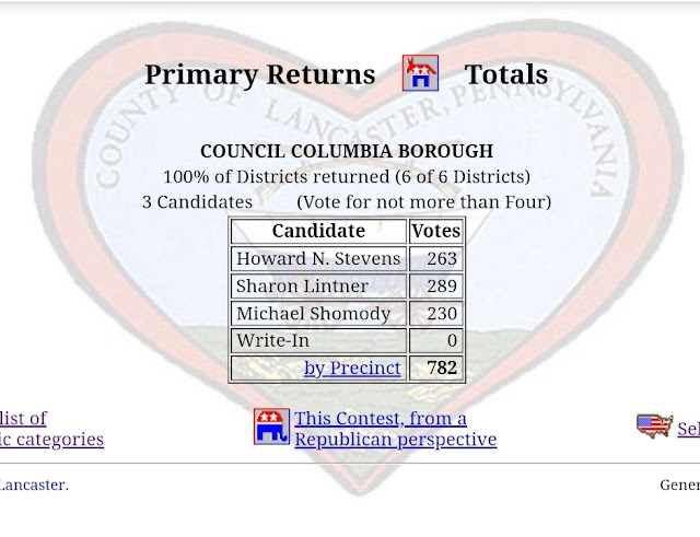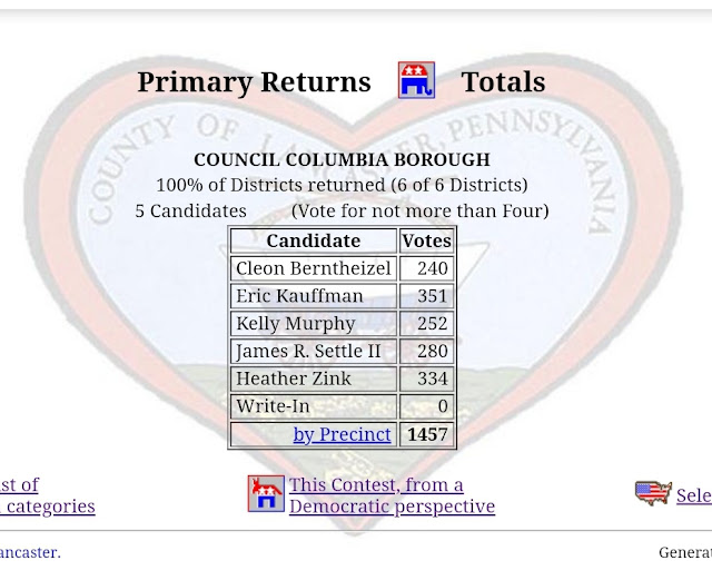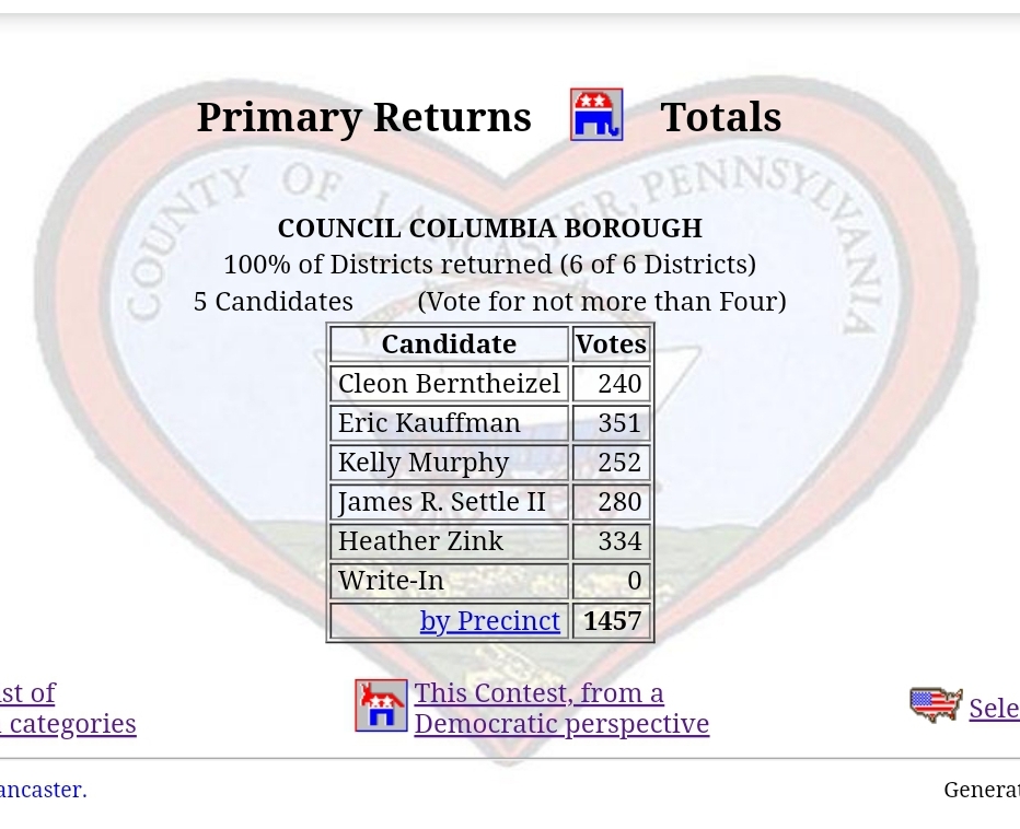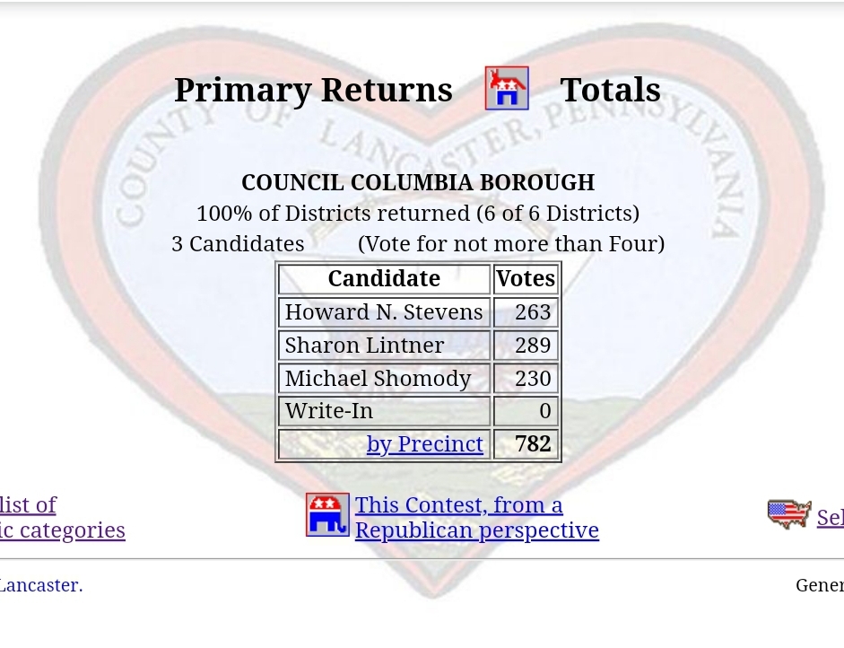 Columbia Borough Primary Election Returns Share this: Share on X (Opens in new window) X Share on Facebook (Opens in new window) Facebook More Share on Bluesky (Opens in new window) Bluesky Share on X (Opens in new window) X Like Loading... Related