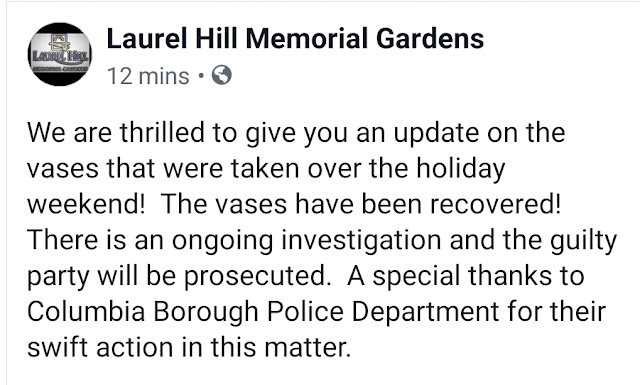 Vases stolen from Laurel Hill Cemetery recovered; guilty party to be prosecuted LINK Share this: Click to share on X (Opens in new window) X Click to share on Facebook (Opens in new window) Facebook More Click to share on Bluesky (Opens in new window) Bluesky Click to share on X (Opens in new window) X Like Loading... Related