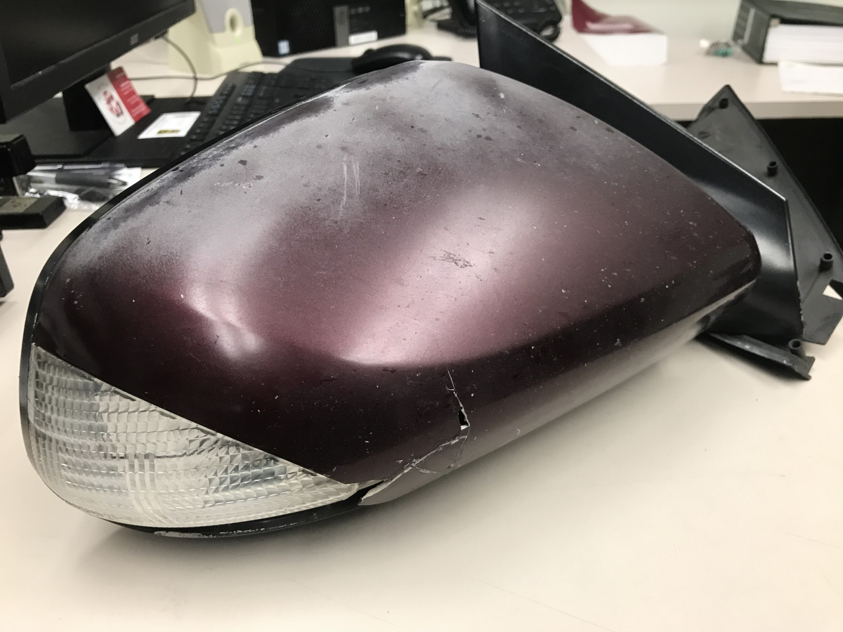 At 10:45 p.m. on 06-04-2019, a car ran the stop sign at 5th and Maple St. causing a collision with another occupied vehicle. The suspect vehicle then fled west on Maple St. The suspect vehicle was a dark colored sedan and will have significant damage to the passenger side, to include a missing window and side mirror. A window recovered at the scene had aftermarket tint film on it. The passenger side mirror from the suspect vehicle was also found at the scene. It is maroon in color (photo attached).