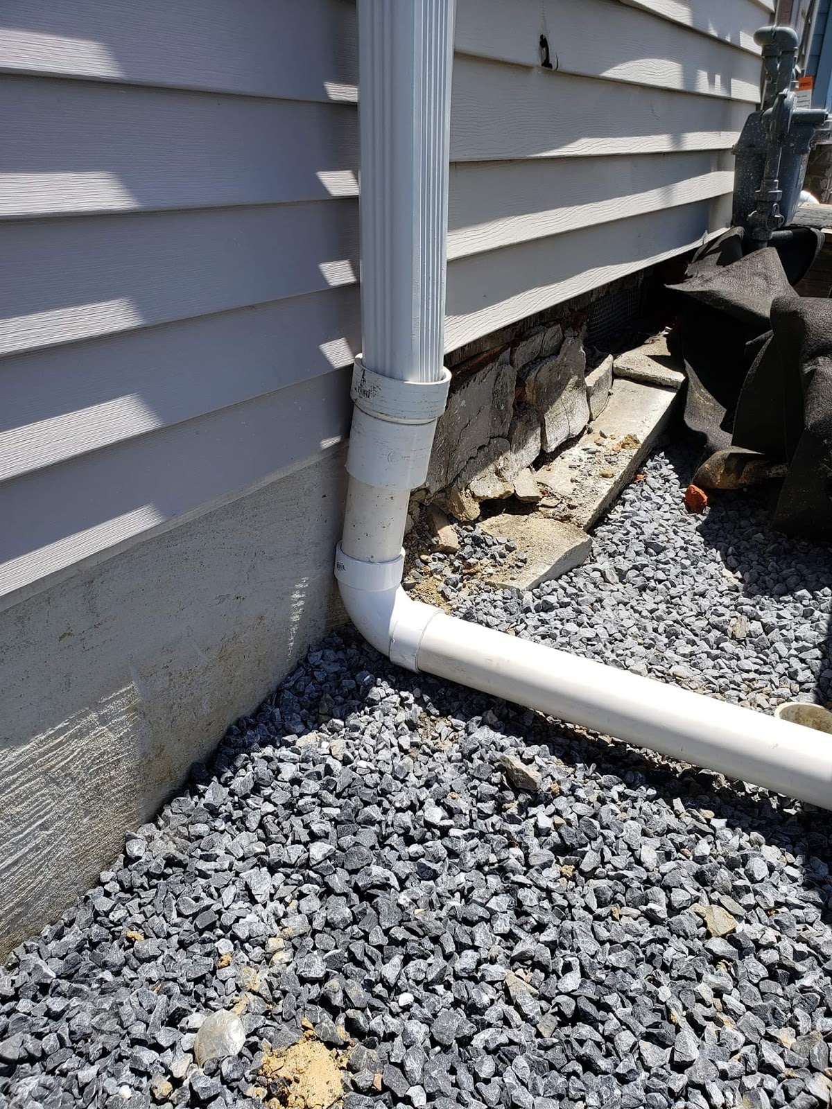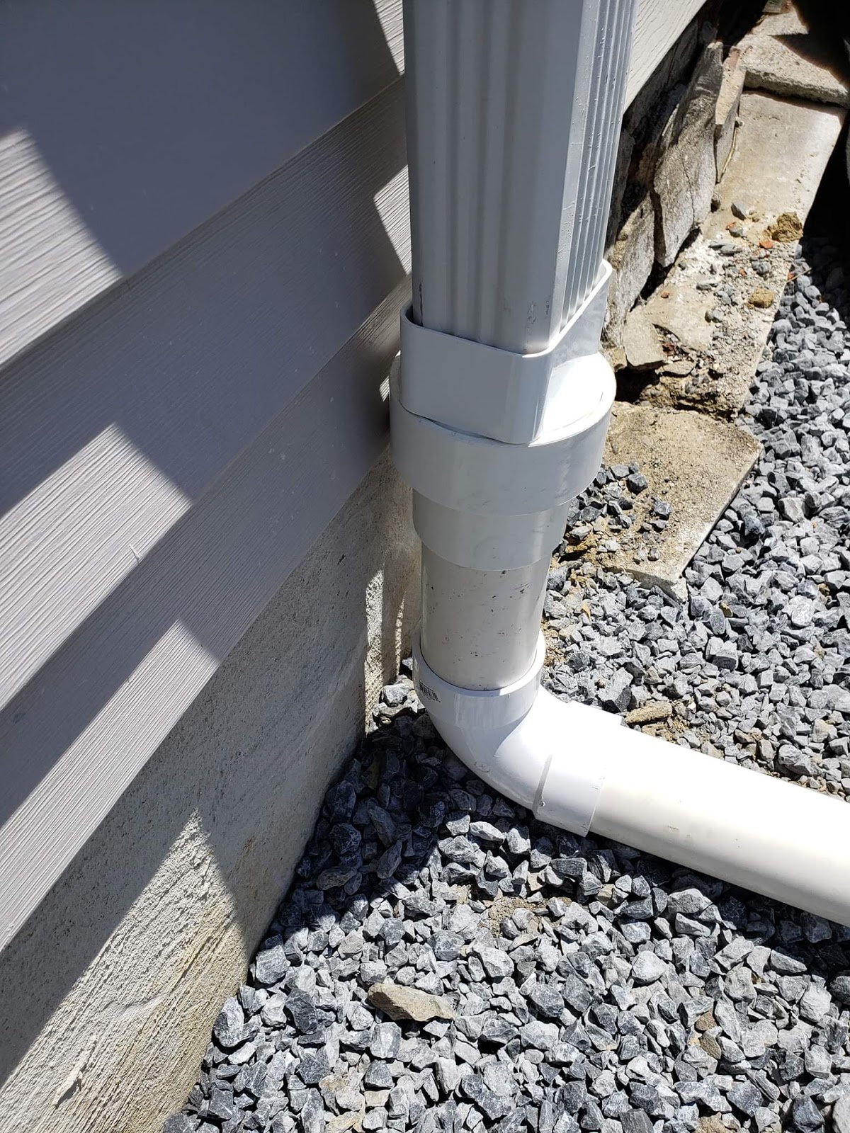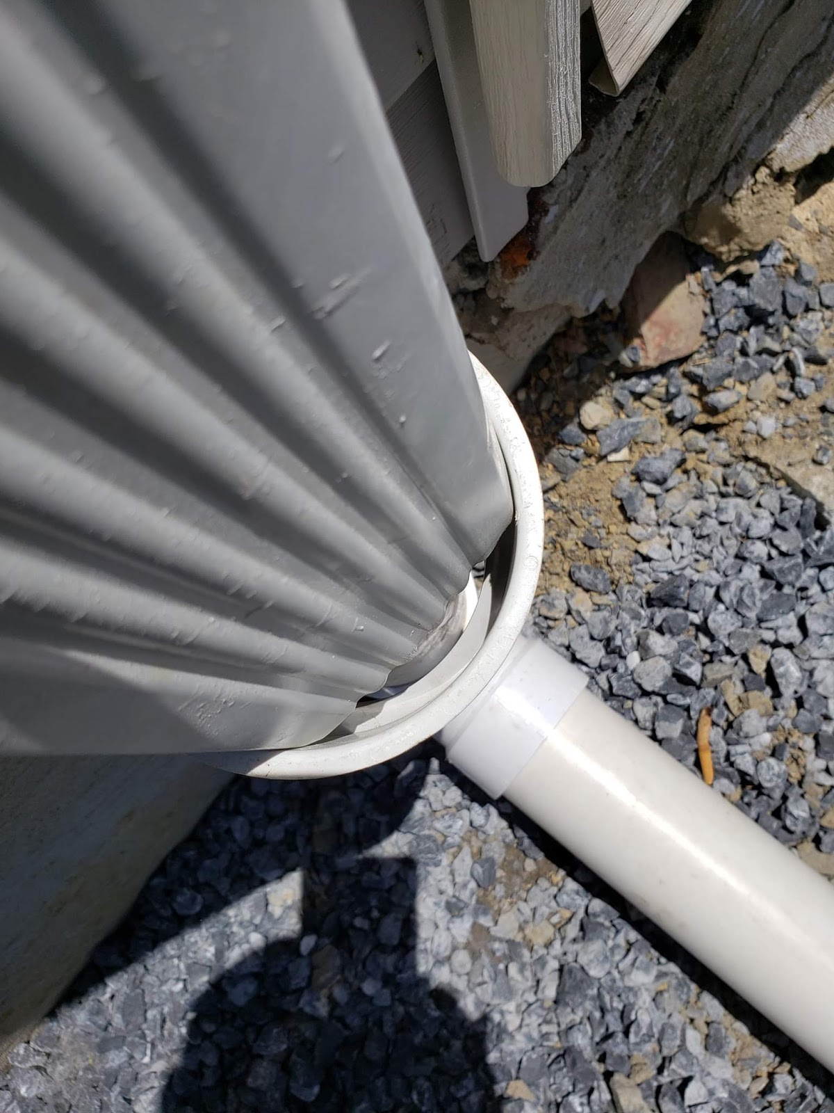 The following four photos show the before and after of a downspout connection at his house. The first two show the work done by the contractor. Shade did the fix shown in the last two photos. He also said the sidewalk joints are crooked and wavy, and some of the curbs are cracked.