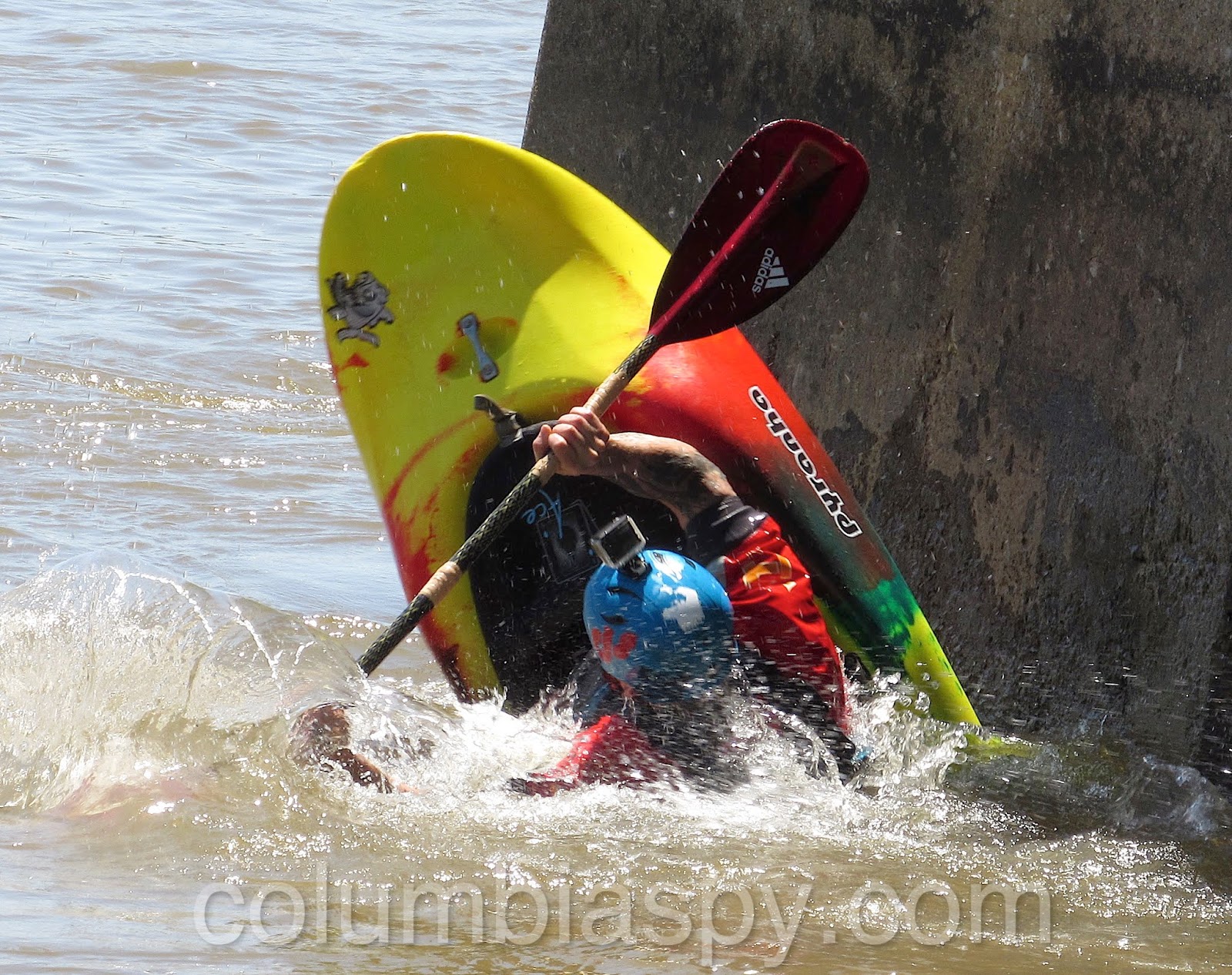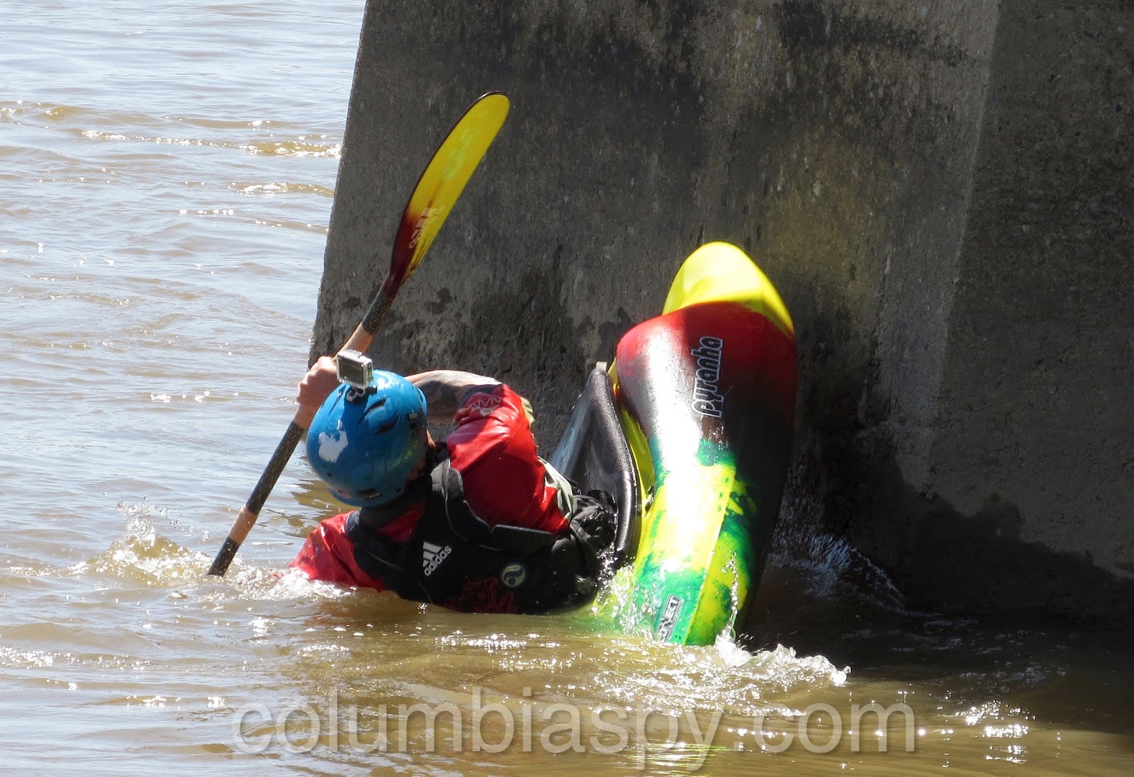 A kayaker practicing kayak roll training techniques under the bridge on Tuesday