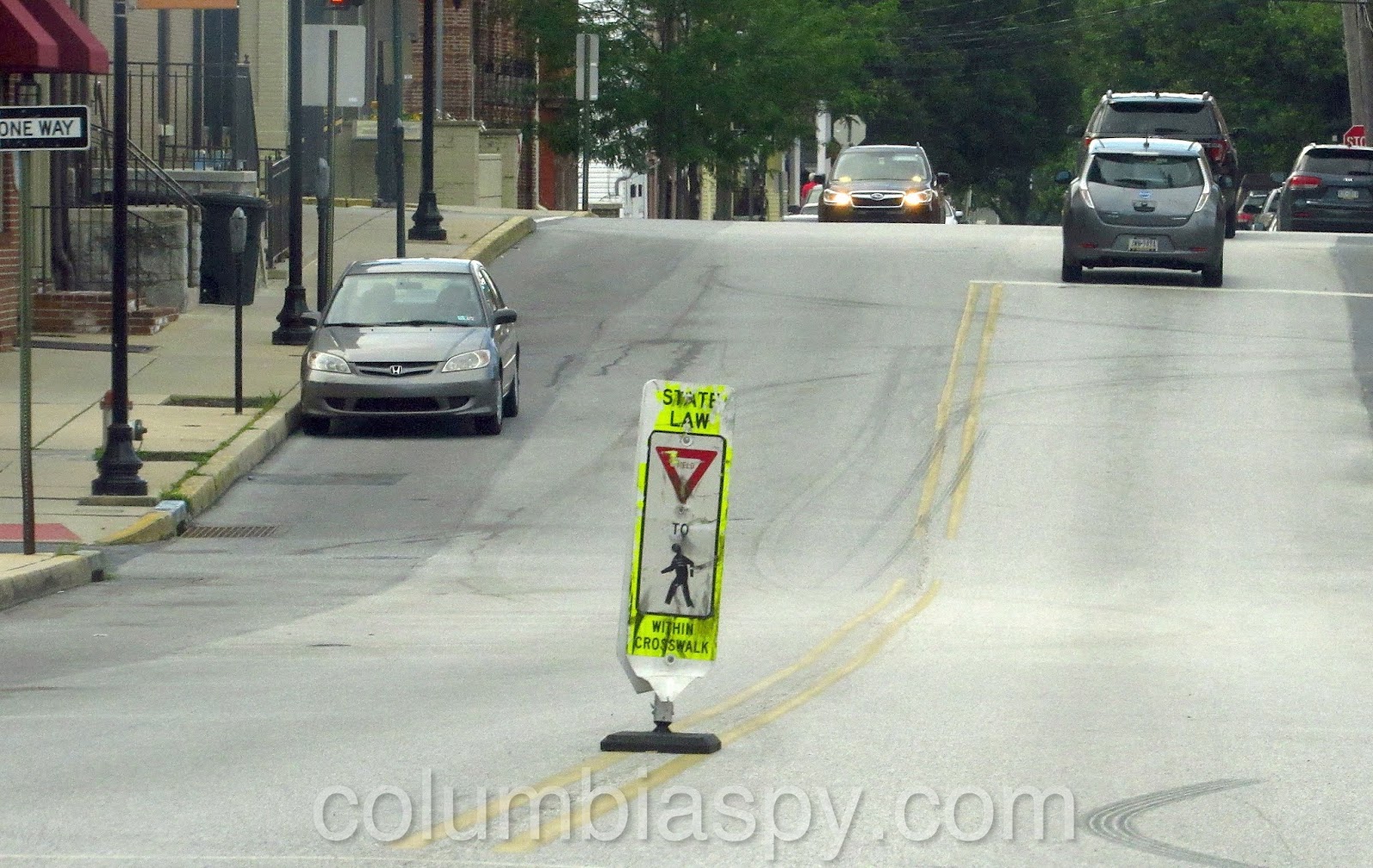 Crossing sign on North 3rd, badly beaten
