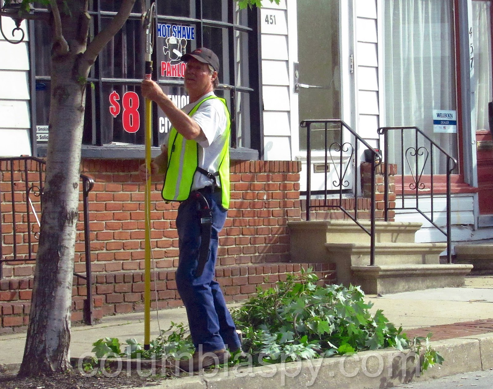 Columbia Park Rangers trimmed trees, applied mulch, and generally cleaned up several blocks of Locust Street on Saturday. Some of the tree grates on the 300 block appear to have been removed.