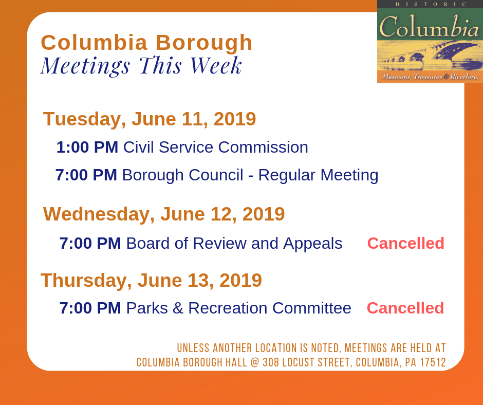 Columbia Borough Meetings – Week of June 10, 2019 Share this: Share on X (Opens in new window) X Share on Facebook (Opens in new window) Facebook More Share on Bluesky (Opens in new window) Bluesky Share on X (Opens in new window) X Like Loading... Related