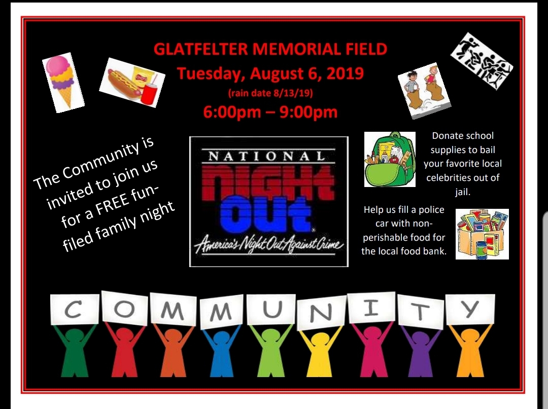 The Columbia Borough Police Department will be hosting their annual National Night Out event on 8/6/19 from 6pm-9pm (rain date 8/13/19) at Glatfelter field located at 1249 Lancaster Avenue, Columbia, PA. Hope to see you there!