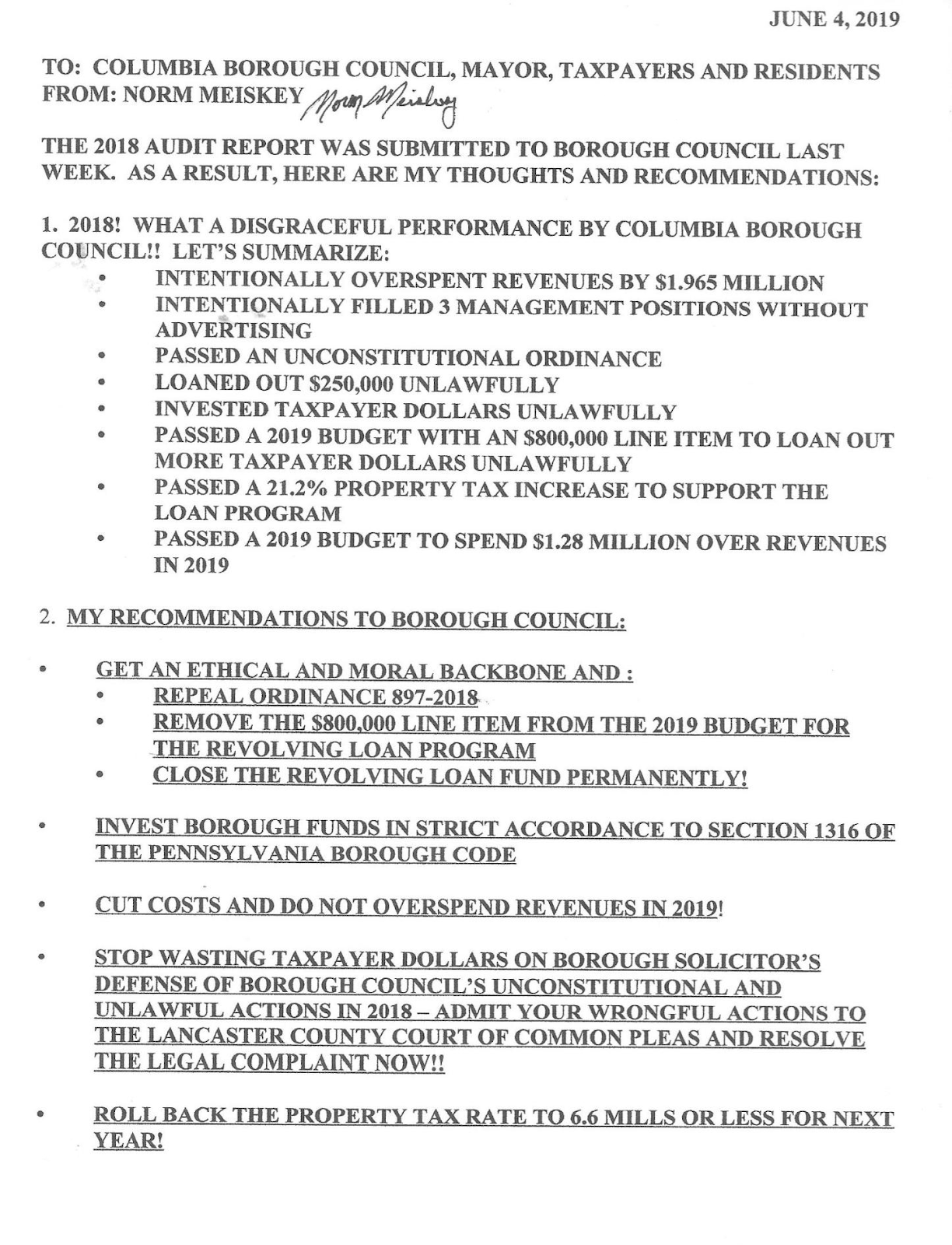 Former Columbia Borough Manager Norm Meiskey reminded Council that the Borough had in the past made several mistakes in hiring, costing hundreds of thousands of dollars it subsequently paid for wrongful hiring. He also said the Borough had signed a consent decree promising that such a thing would never happen again.