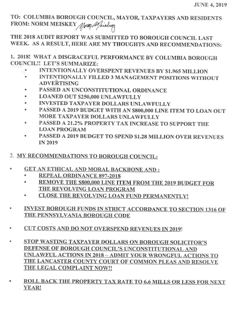 Meiskey told Council that it should put back the $800,000 set aside for the Revolving Loan Fund. “You ought to be doing these things before the court orders you to do it,” Meiskey told Council, referring to a lawsuit currently in progress that was filed by the Columbia Concerned Citizens Association. Meiskey added that returning the funds could help “avoid a $1.28 million deficit this year.” In a victory for the CCCA, Judge Leonard G. Brown, III just ruled that taxpayers have standing in the case, thus overruling the Borough’s preliminary objections and allowing the lawsuit to proceed.