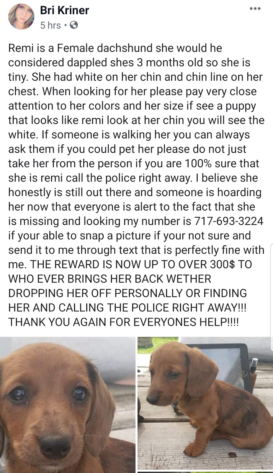 $300 REWARD FOR REMI'S RETURN Share this: Share on X (Opens in new window) X Share on Facebook (Opens in new window) Facebook More Share on Bluesky (Opens in new window) Bluesky Share on X (Opens in new window) X Like Loading... Related
