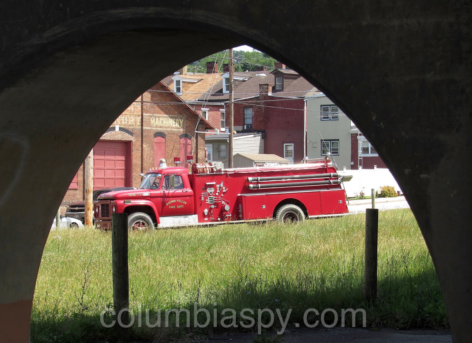 The reality of a fire truck under the illusion of a Gothic arch