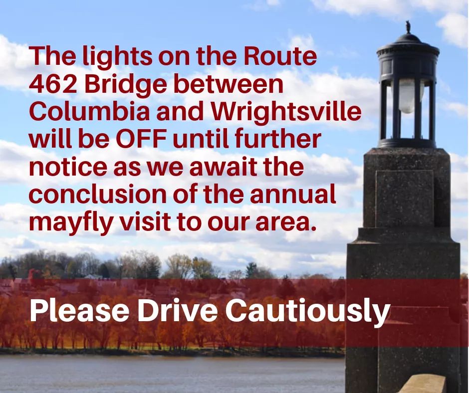 LIGHTS OUT: Lights on the Veterans Memorial Bridge (Route 462) will be off until further notice Share this: Click to share on X (Opens in new window) X Click to share on Facebook (Opens in new window) Facebook More Click to share on Bluesky (Opens in new window) Bluesky Click to share on X (Opens in new window) X Like Loading... Related