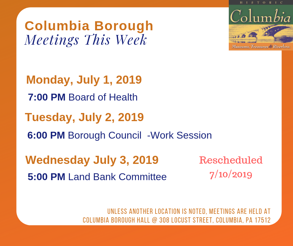 Columbia Borough Meetings – Week of July 1, 2019 Share this: Click to share on X (Opens in new window) X Click to share on Facebook (Opens in new window) Facebook More Click to share on Bluesky (Opens in new window) Bluesky Click to share on X (Opens in new window) X Like Loading... Related