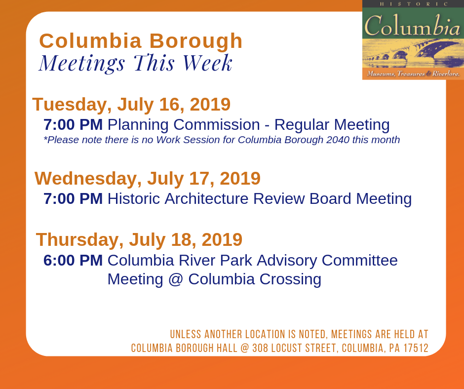 Columbia Borough Meetings – Week of July 15, 2019 Share this: Share on X (Opens in new window) X Share on Facebook (Opens in new window) Facebook More Share on Bluesky (Opens in new window) Bluesky Share on X (Opens in new window) X Like Loading... Related