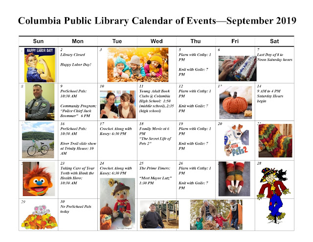 Columbia Public Library Calendar of Events – September 2019 Share this: Share on X (Opens in new window) X Share on Facebook (Opens in new window) Facebook More Share on Bluesky (Opens in new window) Bluesky Share on X (Opens in new window) X Like Loading... Related