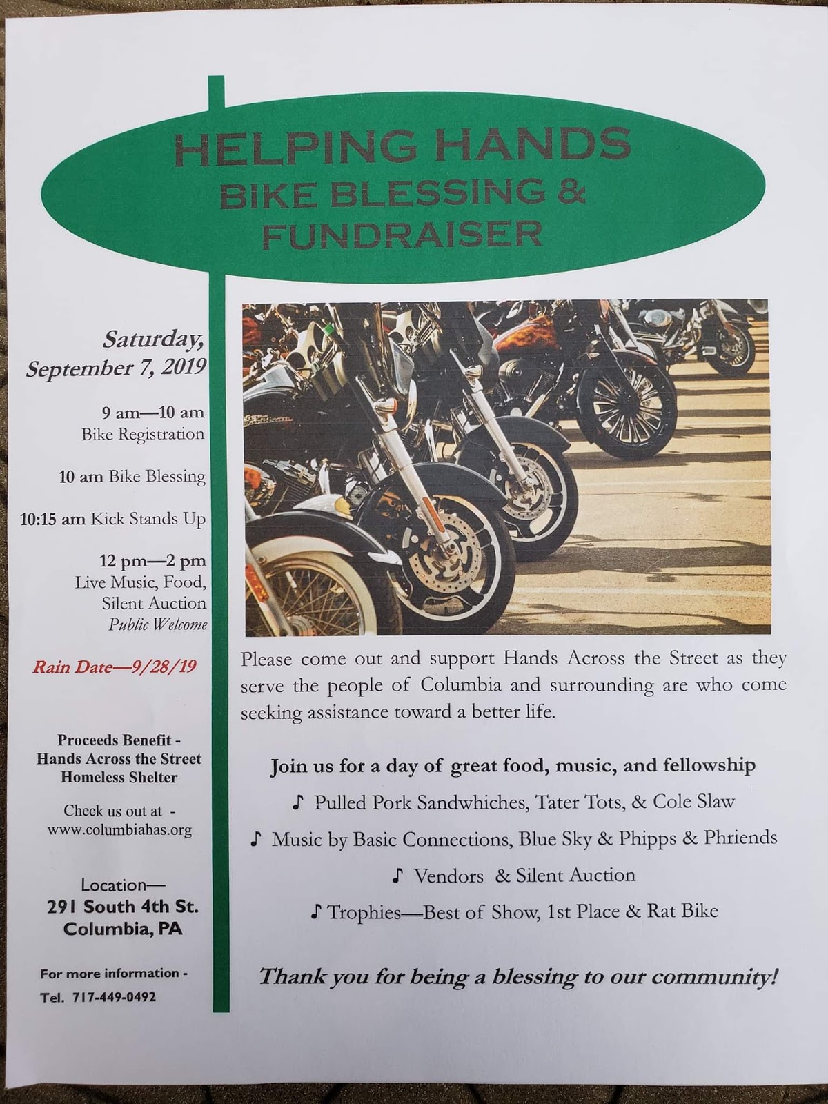 Helping Hands Bike Blessing & Fundraiser to be held Saturday, September 7 Tickets still available, open to public and all bikes welcome!! Ride, food and music, Fundraiser for Columbia homeless shelter!! Saturday September 7th tickets at the door. Share this: Share on X (Opens in new window) X Share on Facebook (Opens in new window) Facebook More Share on Bluesky (Opens in new window) Bluesky Share on X (Opens in new window) X Like Loading... Related