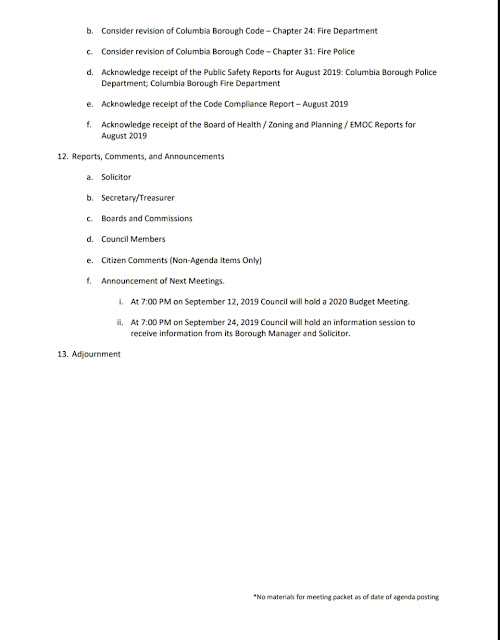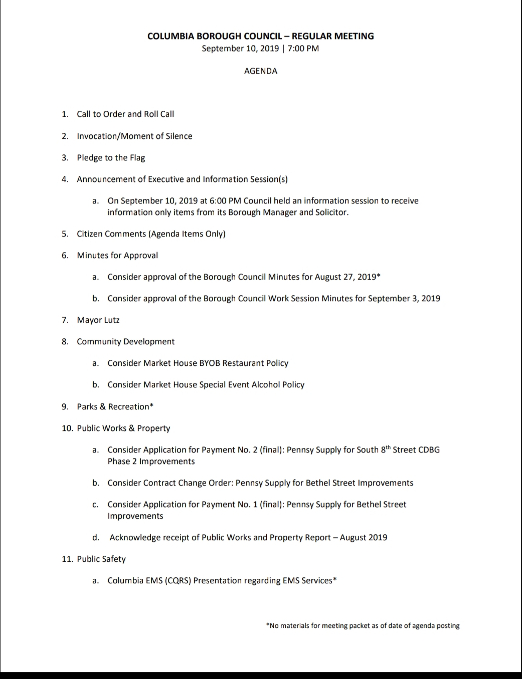 Agenda – Columbia Borough Council Meeting – September 10, 2019 Download the council packet HERE. Share this: Share on X (Opens in new window) X Share on Facebook (Opens in new window) Facebook More Share on Bluesky (Opens in new window) Bluesky Share on X (Opens in new window) X Like Loading... Related
