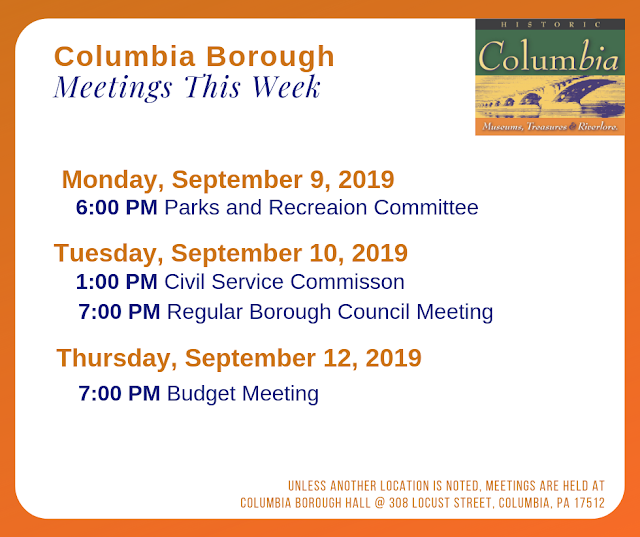 Columbia Borough Meetings – Week of September 9, 2019 Share this: Share on X (Opens in new window) X Share on Facebook (Opens in new window) Facebook More Share on Bluesky (Opens in new window) Bluesky Share on X (Opens in new window) X Like Loading... Related